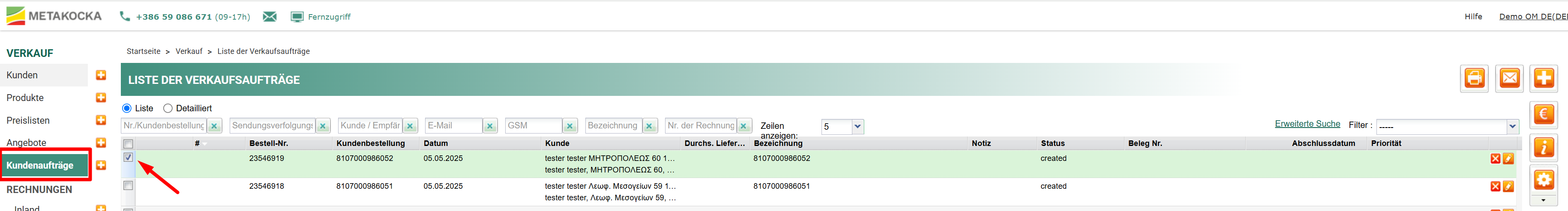 Gespeicherte Bestellungen befinden sich unter Verkaufsaufträgen. Wählen Sie anschließend Liste aktualisieren, damit Ihnen die neuen Bestellungen angezeigt werden.