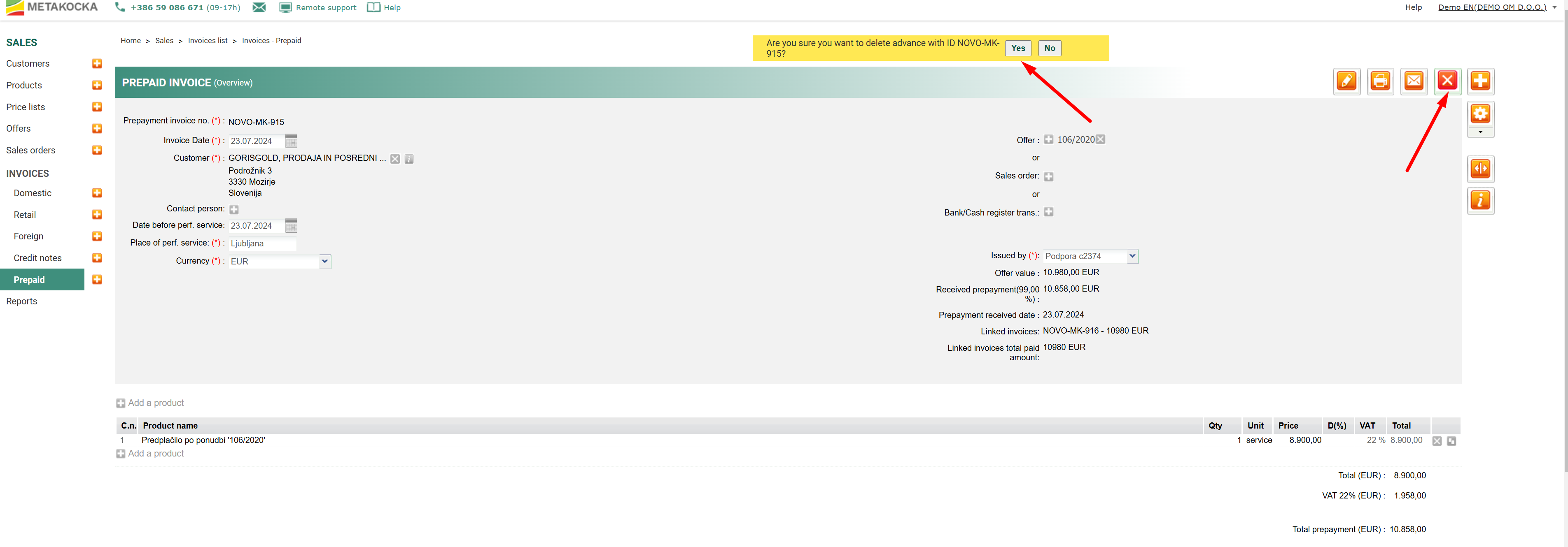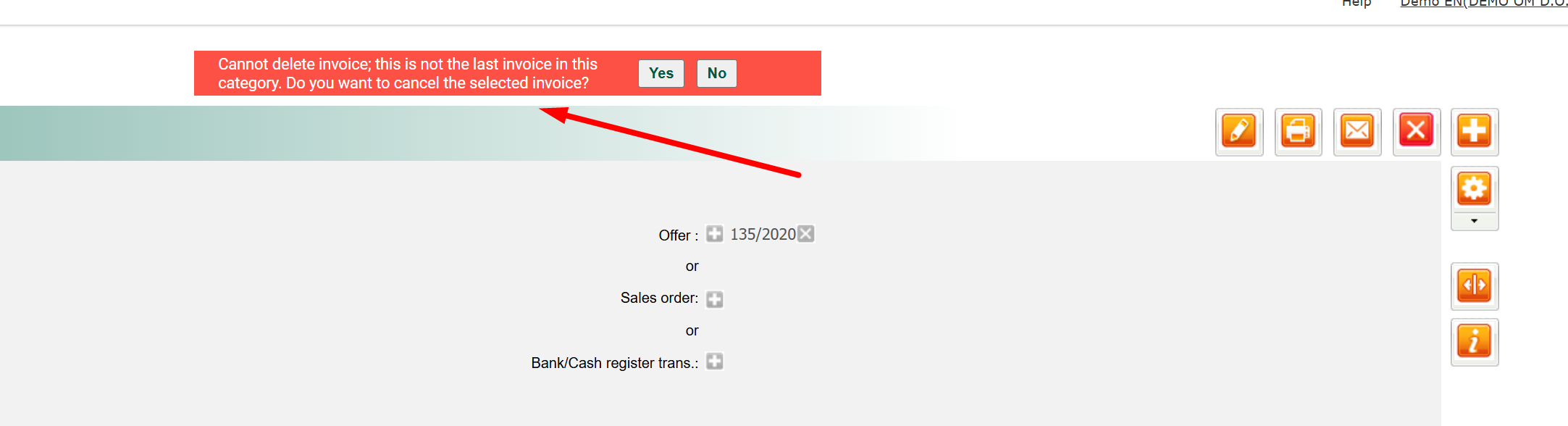 You will see a notice for deleting the invoice - select ''yes''. If the invoice is the last on the list, the program will offer you the option of deleting the invoice. Otherwise you will get this notice as in the picture below.