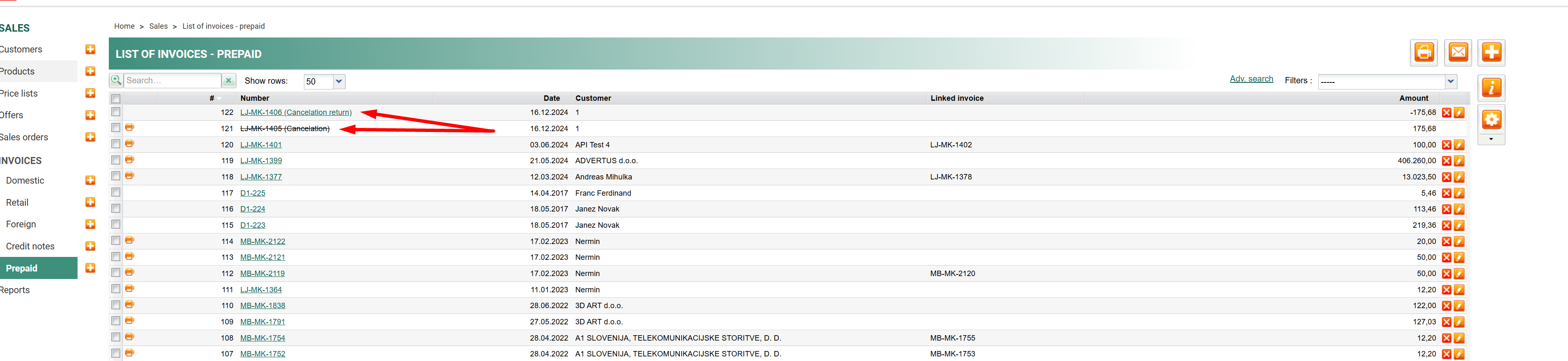 When confirming the cancellation for the prepaid invoice, it is cancelled and at the same time, a new prepaid invoice is generated with the negative value of the cancelled invoice.
