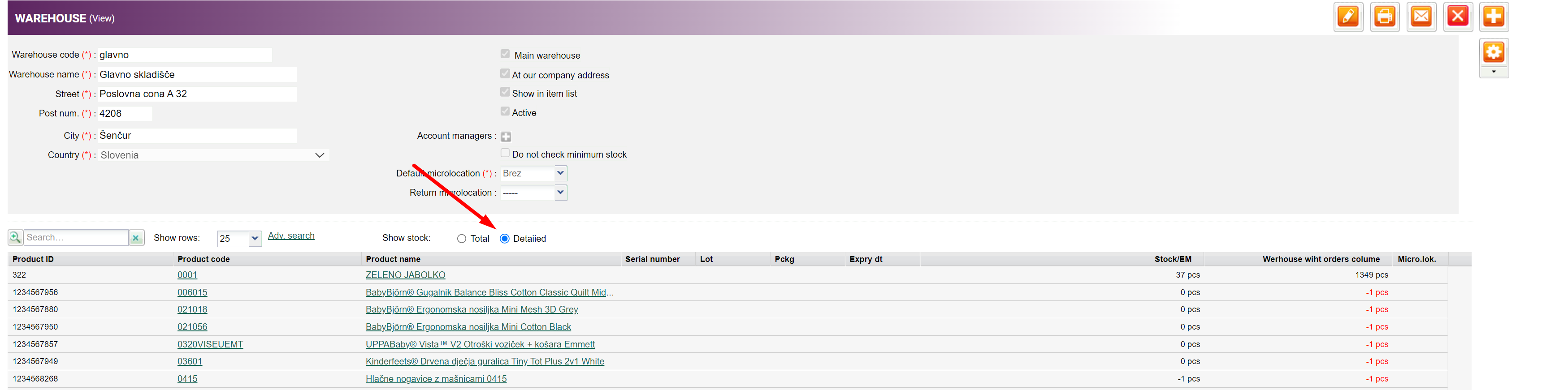 Stock can be verified in the warehouse according to the lot number, by clicking on ''Detailed'' on the Warehouse page