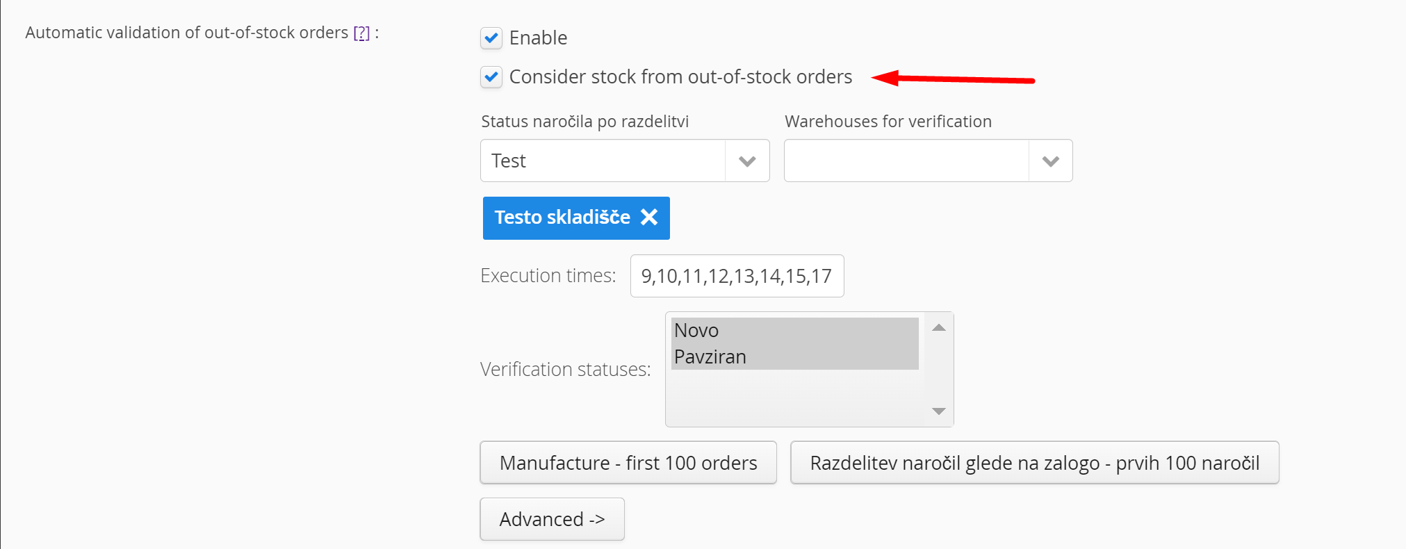 U dodatnim postavkama/Order Management potrebno je omogućiti funkcionalnost Automatsko provjeravanje narudžbi bez zaliha i upisati vrijeme provjere (upišite u koje vrijeme/vremena će se zalihe provjeravati, i odvojite ih zarezom)