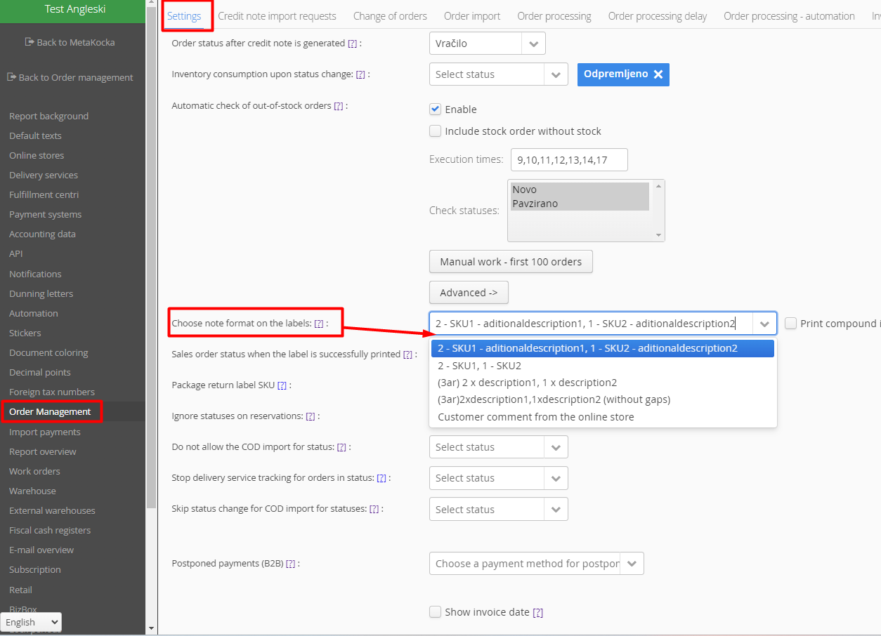 In additional settings, selecting the note format displayed on the labels printed from each delivery service is possible for users who print labels via Order Management.