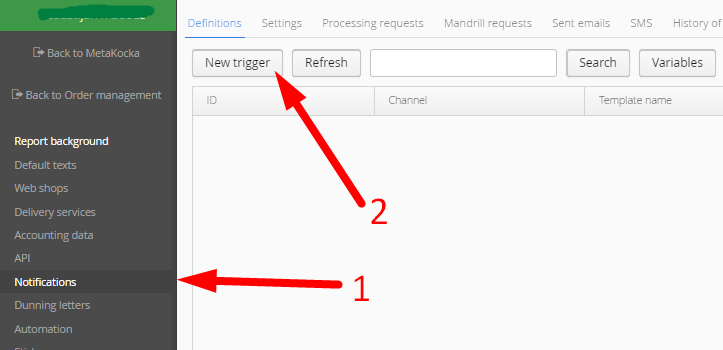 When additional settings open, click on ''Notifications''/''Definitions'' and then ''New trigger''.