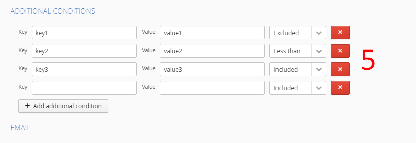 Here, additional conditions for sending notifications can be specified by specifying a key-value couple, which must / must not be present in the order's metadata.