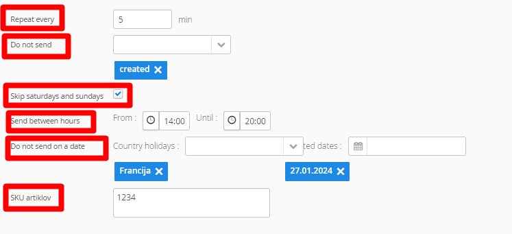 - Send between hours: specify between which hours SMS message will be sent, if hours are not specified, SMS messages will begin with sending from 8 in the morning onwards.