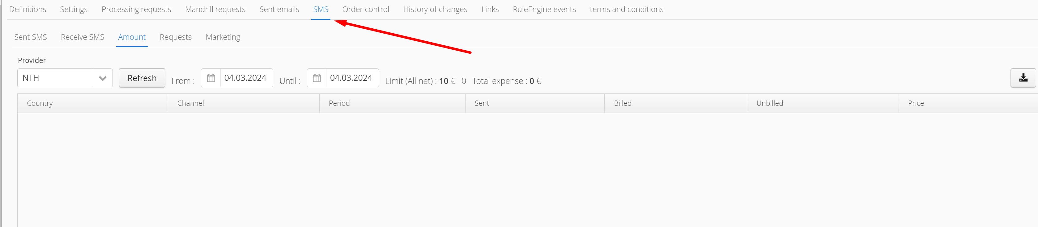 Sent SMS can be viewed in the ''Sent SMS'' and ''Amount'' tabs, where SMS sending costs are displayed, while below the current SMS pricing can be found.