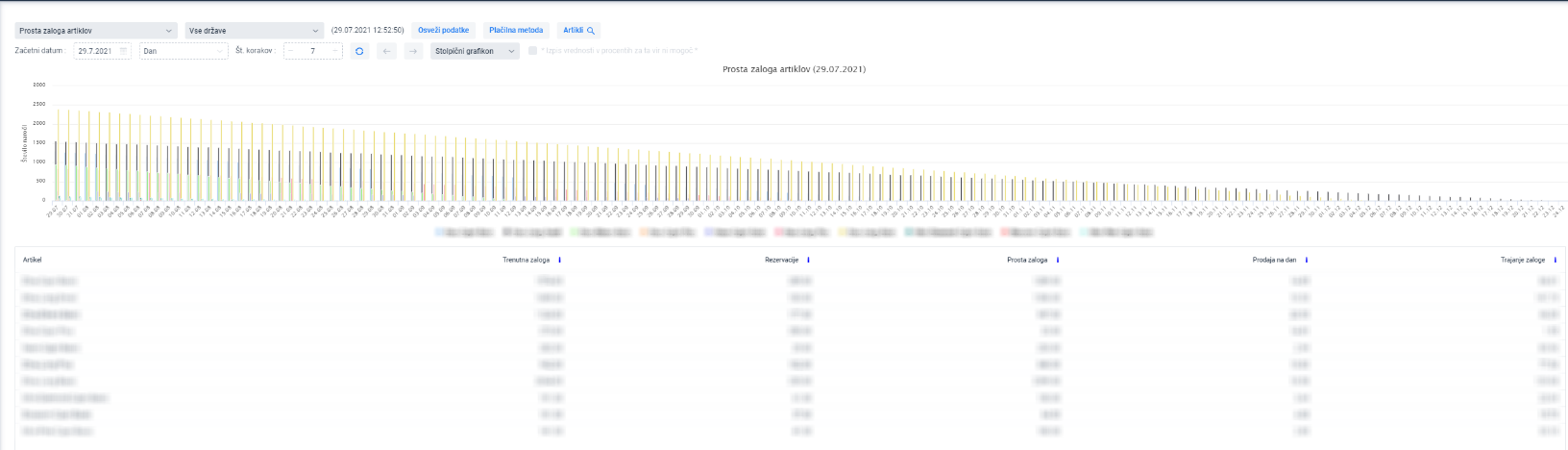 Product free stock graph displays the Current product stock, Reservations for products, Free stock, sales stock on the day, and Stock duration.