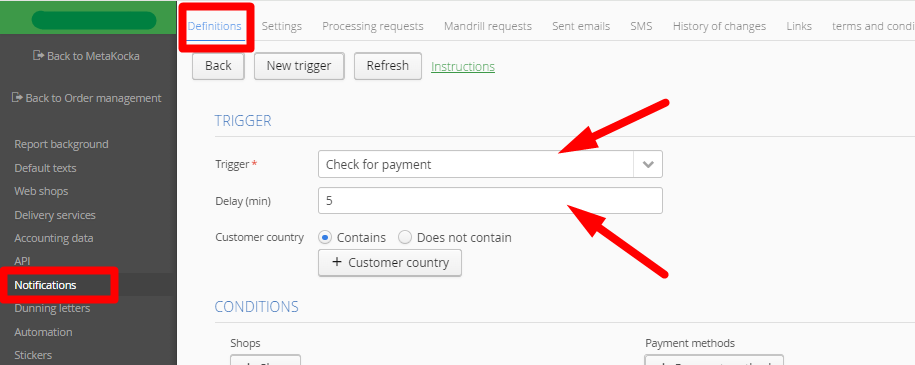 Set the definition of the trigger for Entering the document. The trigger will activate your selling SMS accordingly upon recording the order in Metakocka.