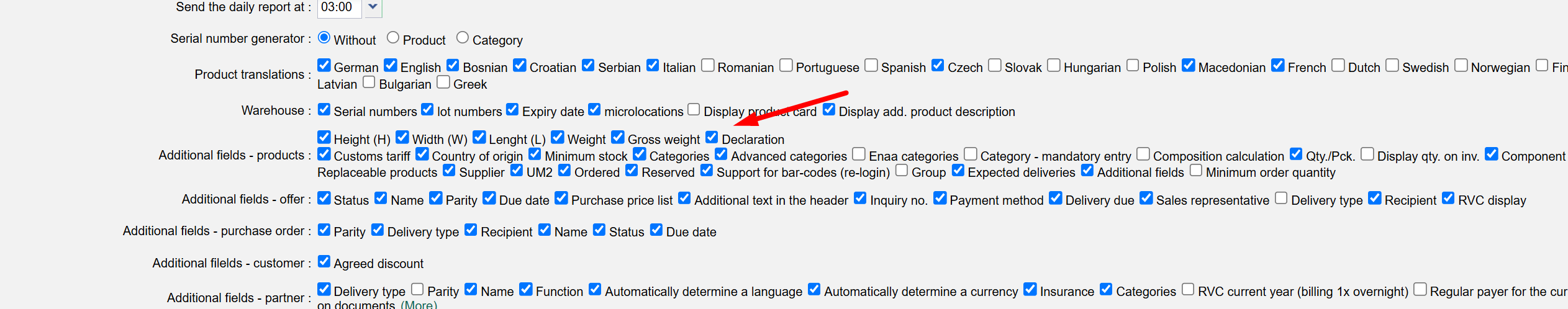 In Settings/Your company/Additional field - products, select Declaration