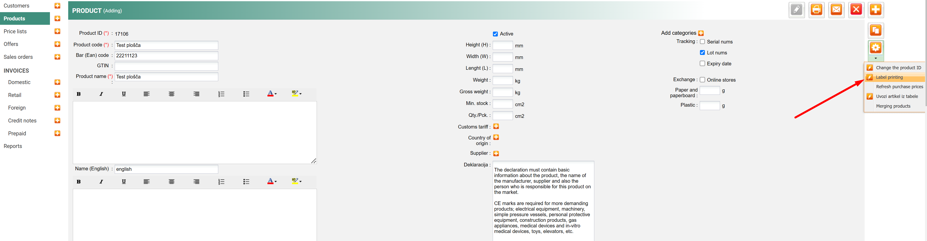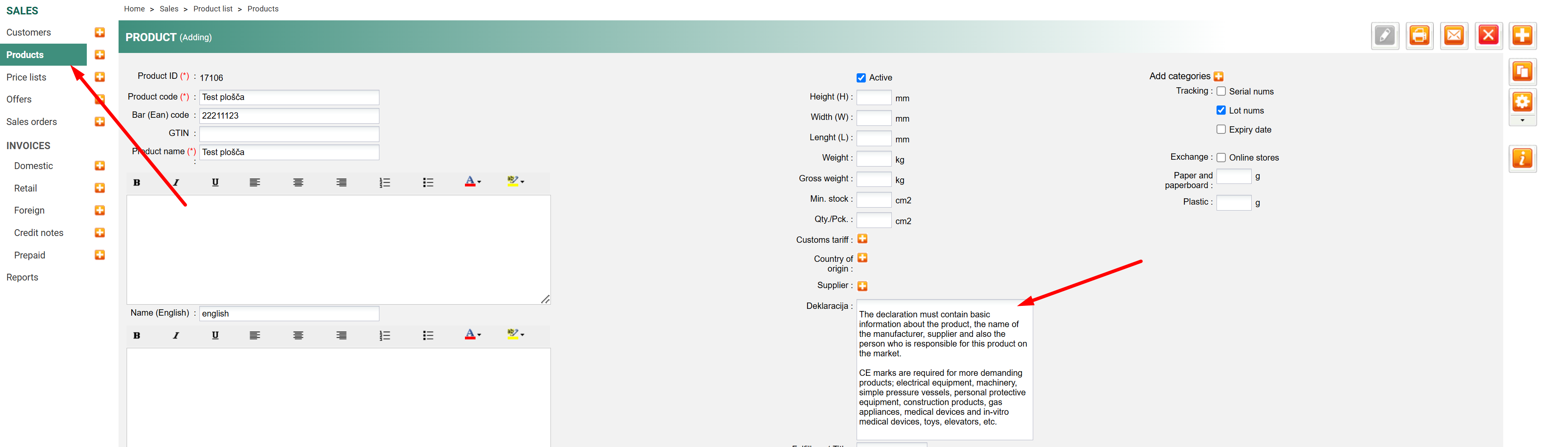 On the product page, a "window" will be displayed in which declaration data can be added; after filling in the data, save changes.