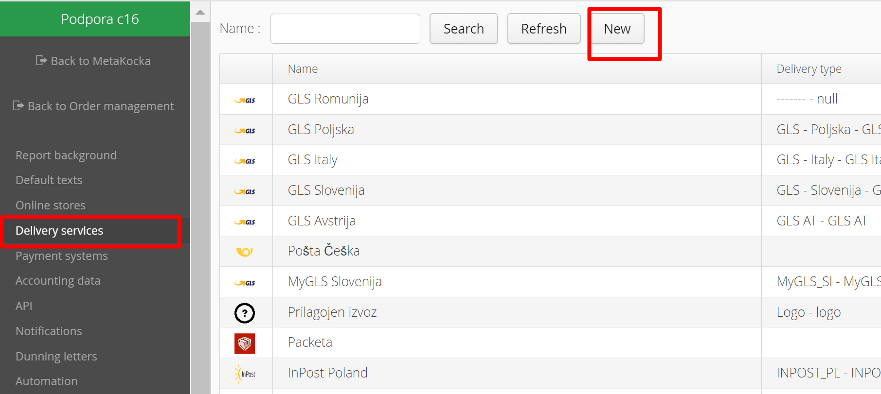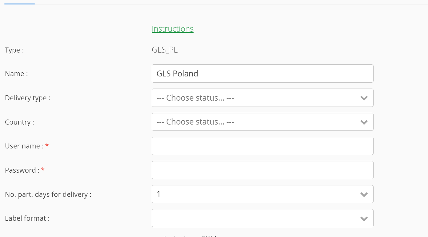 3. Enter the password and username that you received from GLS, specify the new type of delivery that will be used for the delivery company (+).