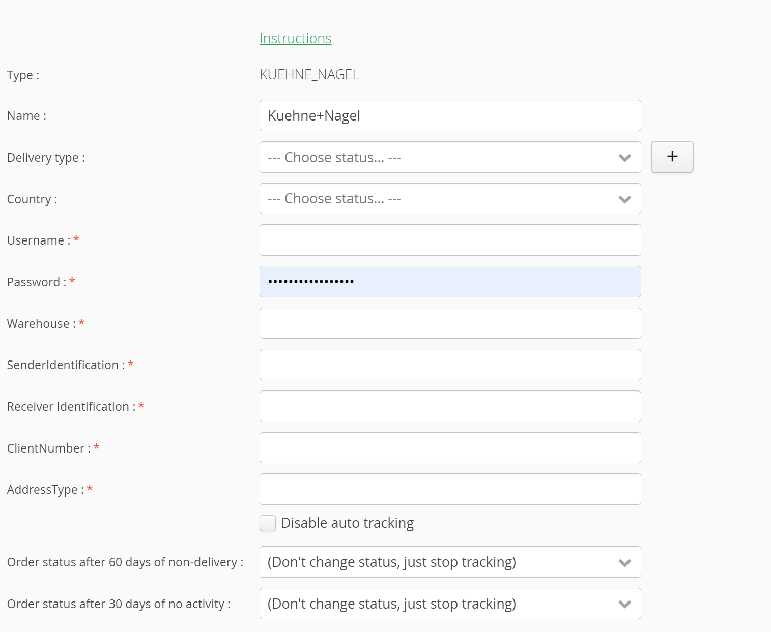 3. Enter the password and username that you received from Kuehne + Nagel, specify the new type of delivery that will be used for delivery service KUEHNE+ NAGEL, you can add new (+).