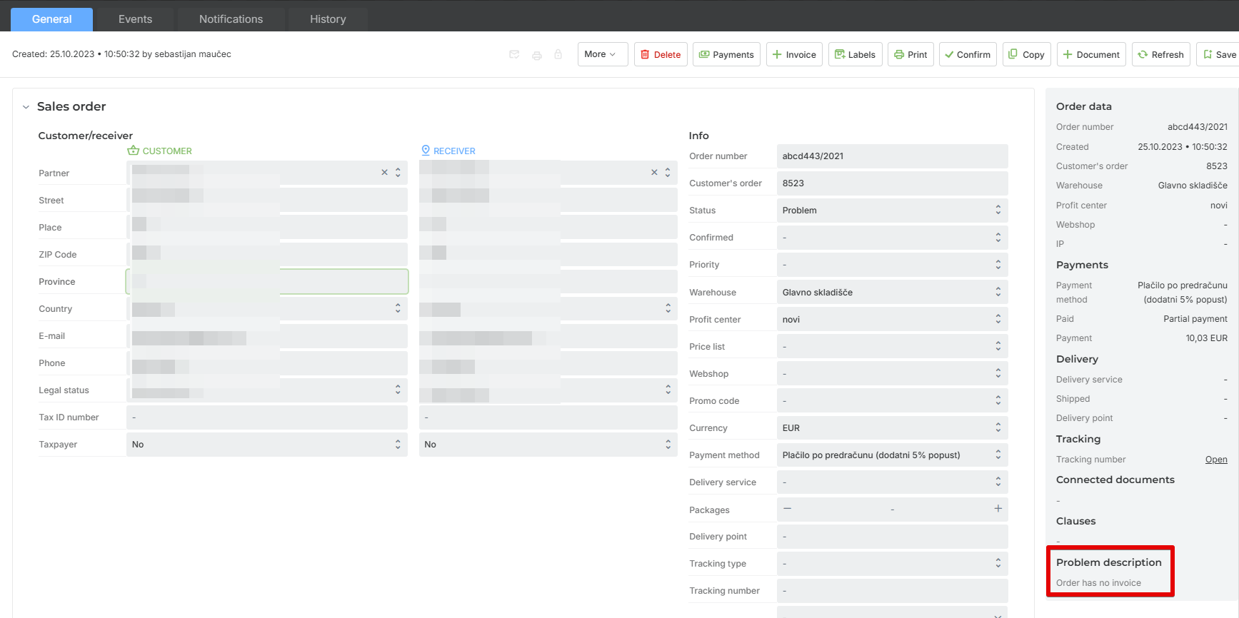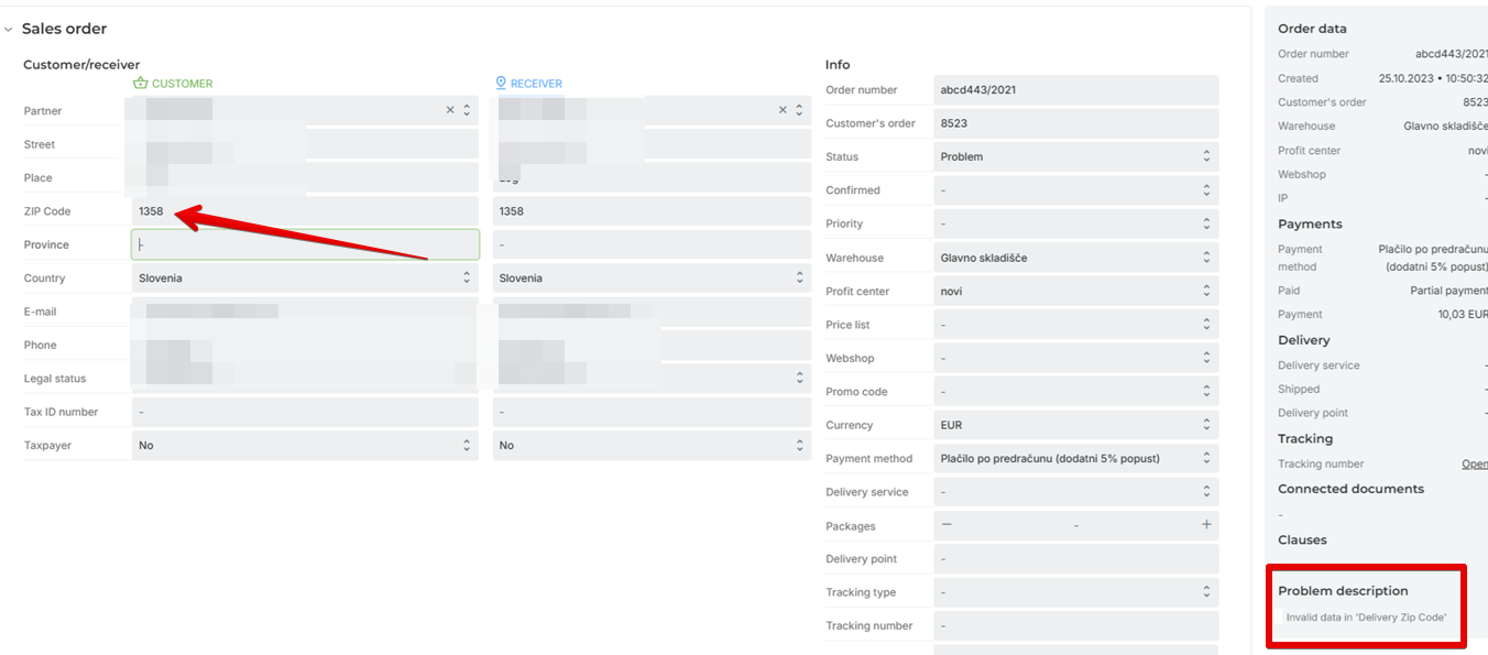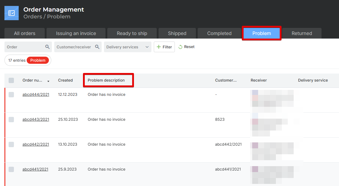 If an order acquires the Problem status, it will also be visible in the tab of the same name.