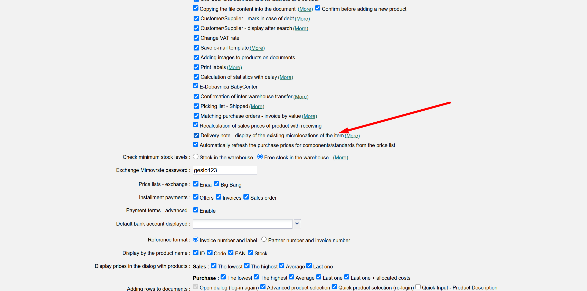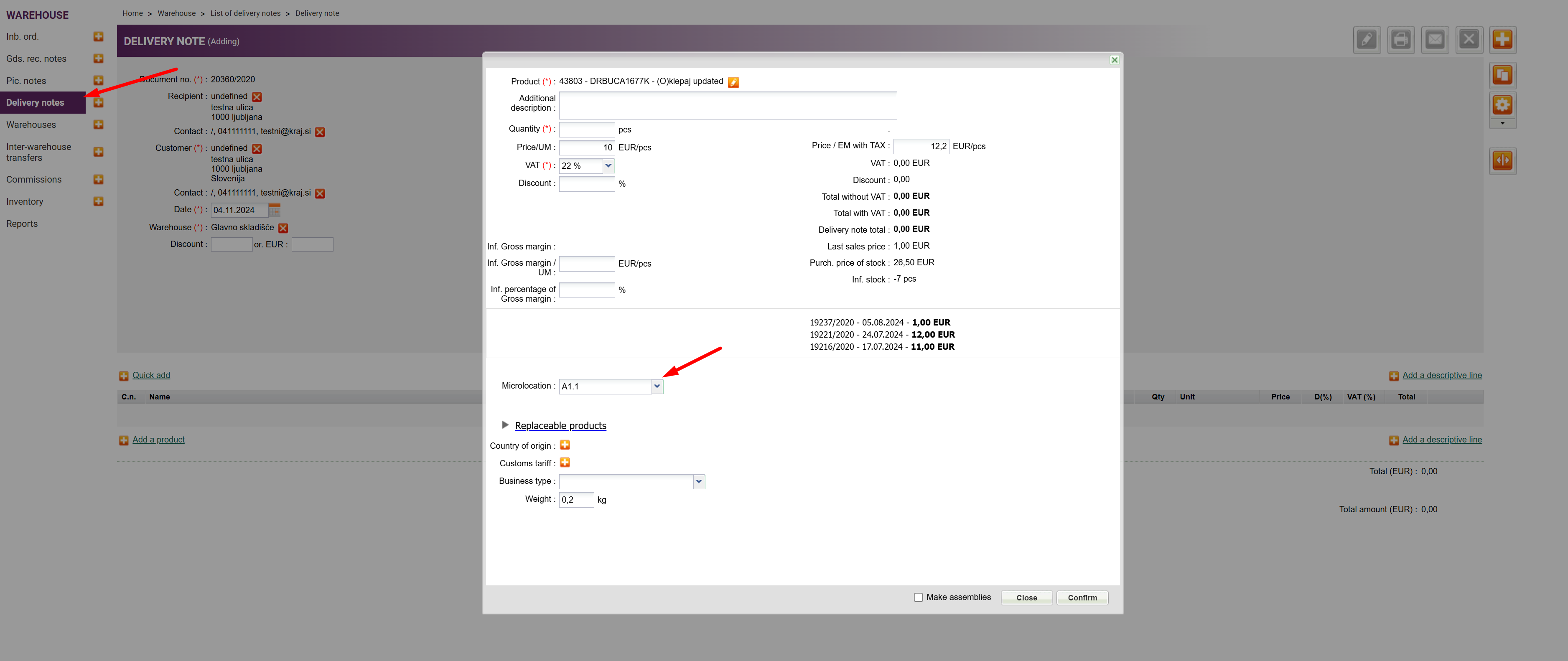 By enabling the functionality, only the microlocations where the item is located in the selected warehouse are displayed when choosing an item on the delivery note.
