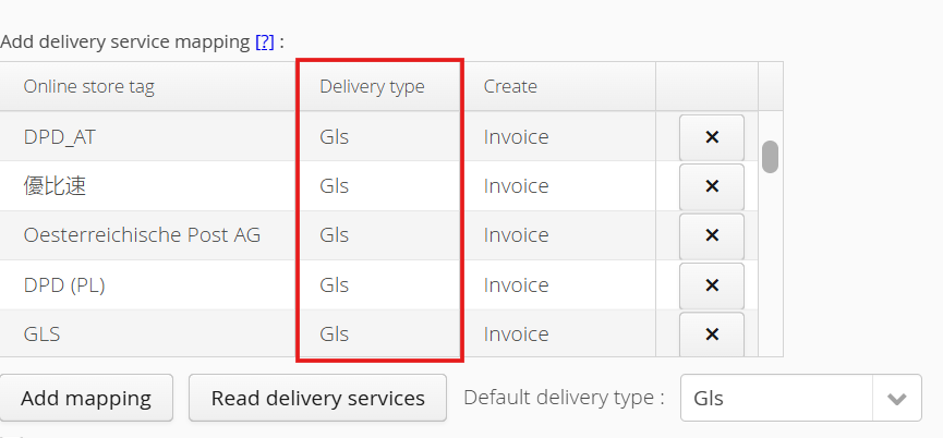 Clicking on Read Delivery Services will provide a list of all valid delivery services for the selected country. You should then arrange the mapping of these services with your entries for Delivery Type in Metakocka.
