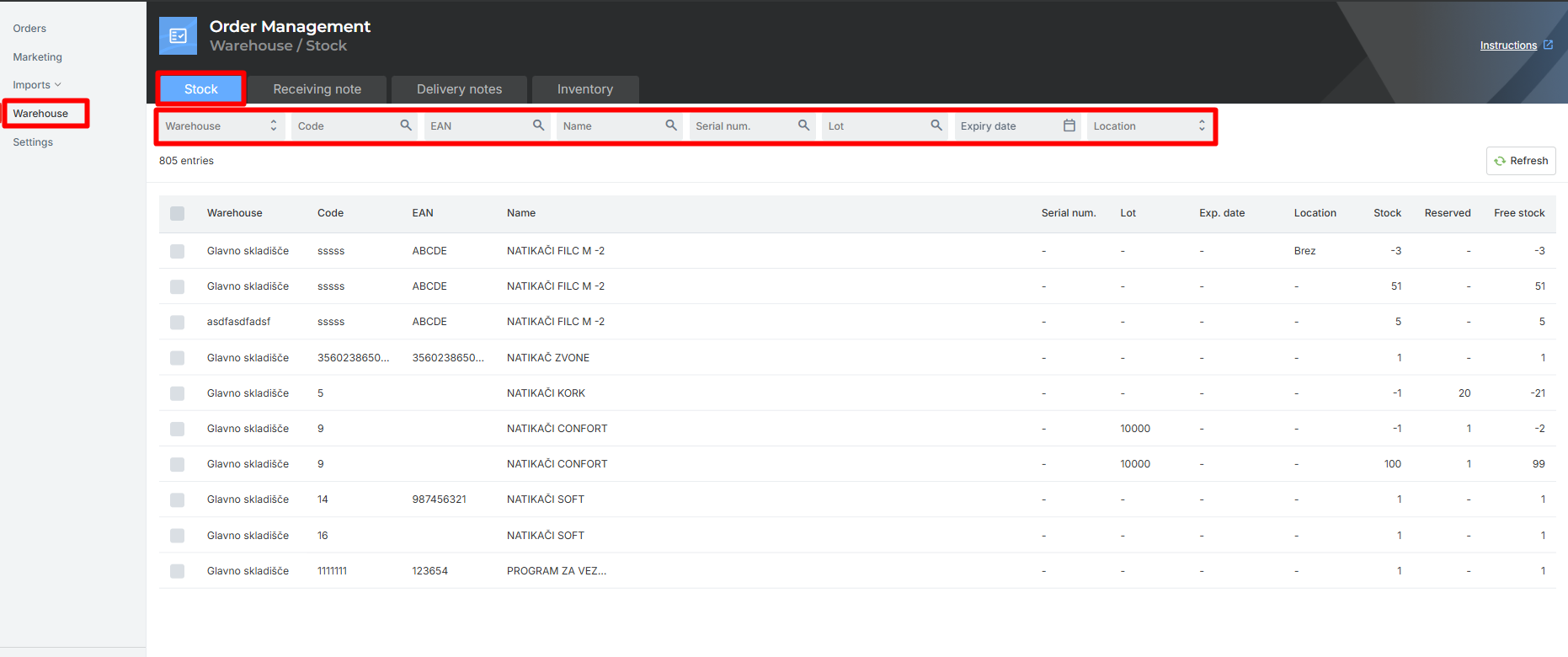 Within Order Management, you now also have access to the warehouse overview. You can view inventory, created goods receipts, created delivery notes, and inventory.