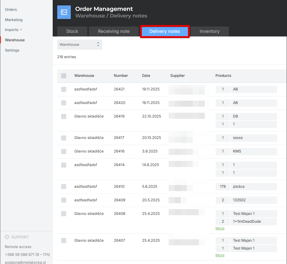 In the Delivery Notes tab, you can see all created delivery notes as well as the items included in each delivery note.