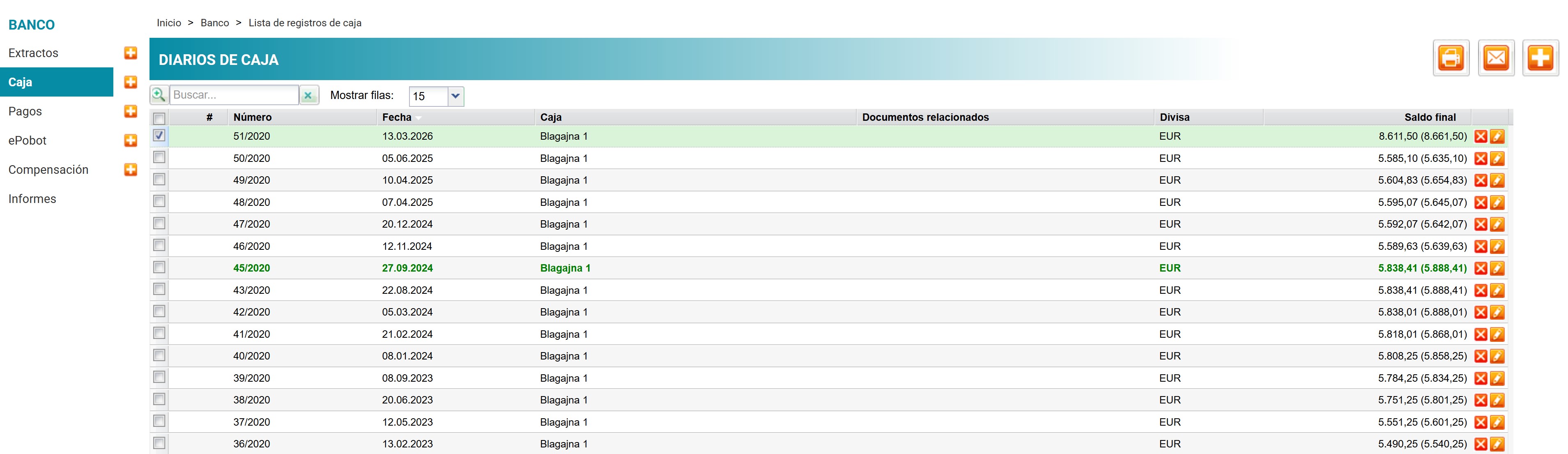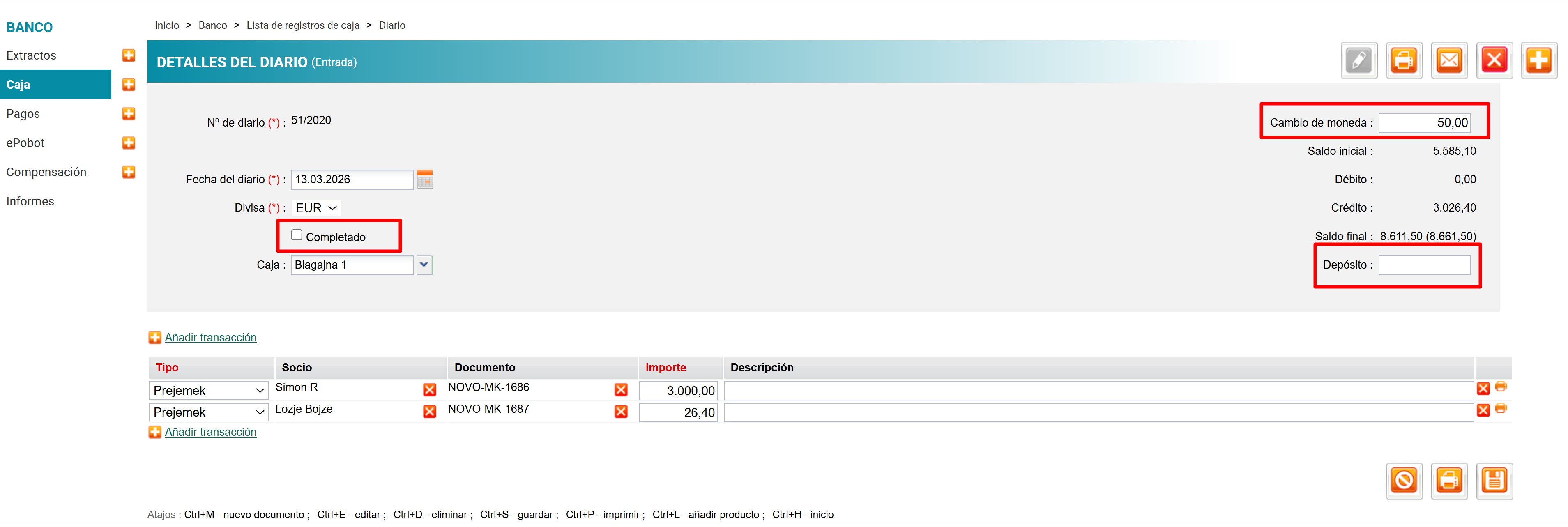 Si se modifican extractos bancarios anteriores (cambios en el pago de la transacción), el saldo inicial y final de todos los extractos se actualizarán automáticamente (para la misma caja). El requisito previo es que en "Su empresa" esté configurada la opción "Caja - depósito desde la fecha".
