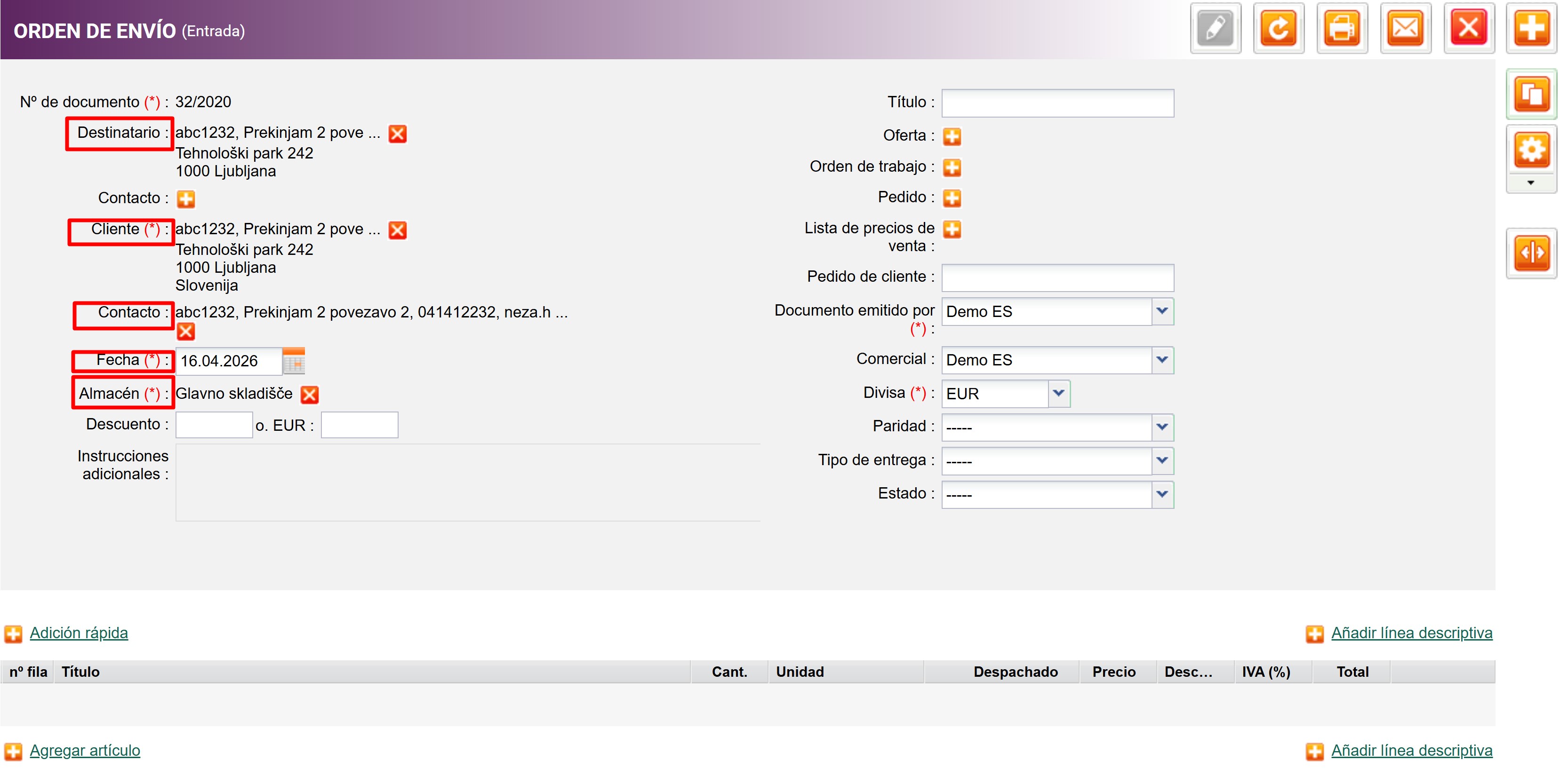 Introduzca los datos en la cabecera del registro de la orden de envío. Los campos obligatorios están marcados con un asterisco (*)