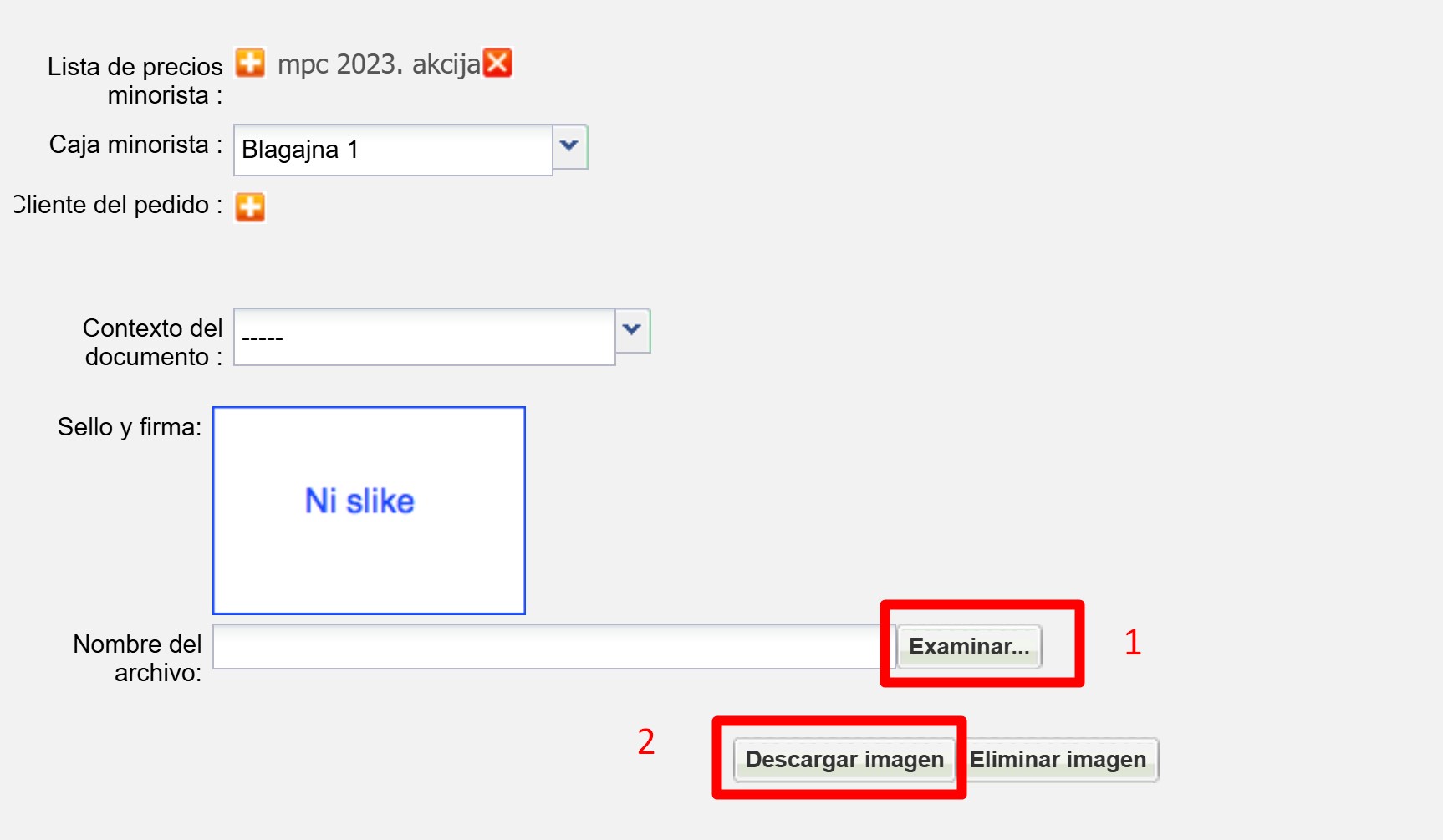 Pulse sobre el usuario. Seguidamente pulse sobre el icono del lápiz para editar, localice el recuadro para añadir el sello y la firma, clique en "Examinar" y después en " Descargar imagen".