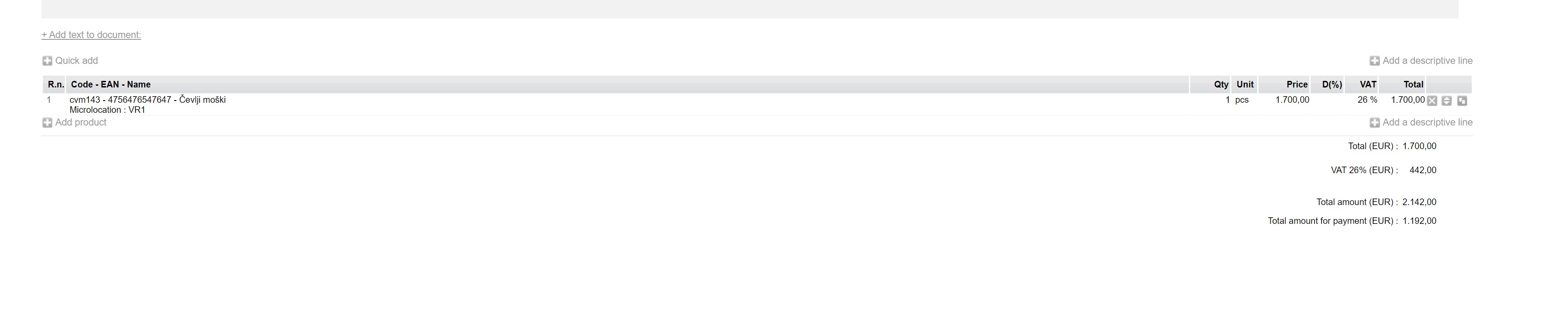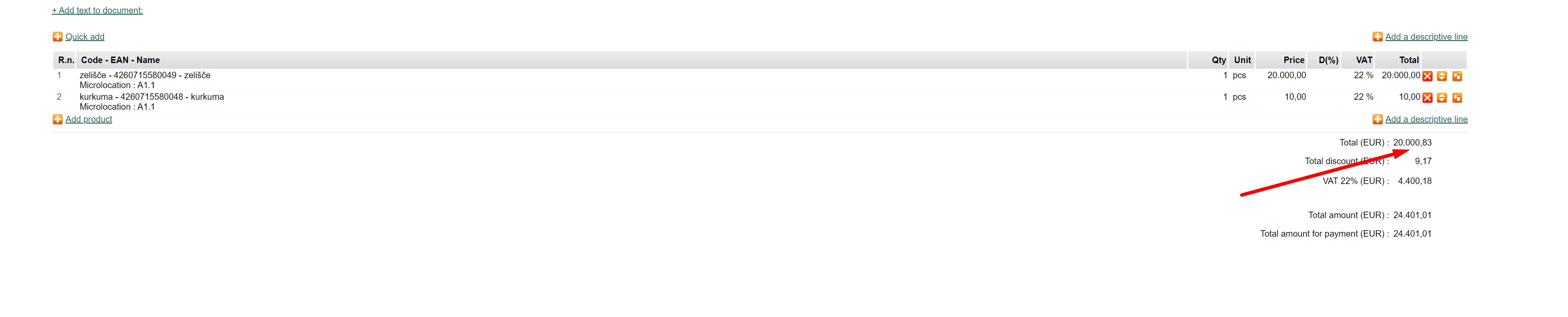 Veamos la factura con el precio de producto 0,00023 EUR y la cantidad 203. Para la factura impresa, el precio debería redondearse a 4 y a 2 decimales (en total) respectivamente.