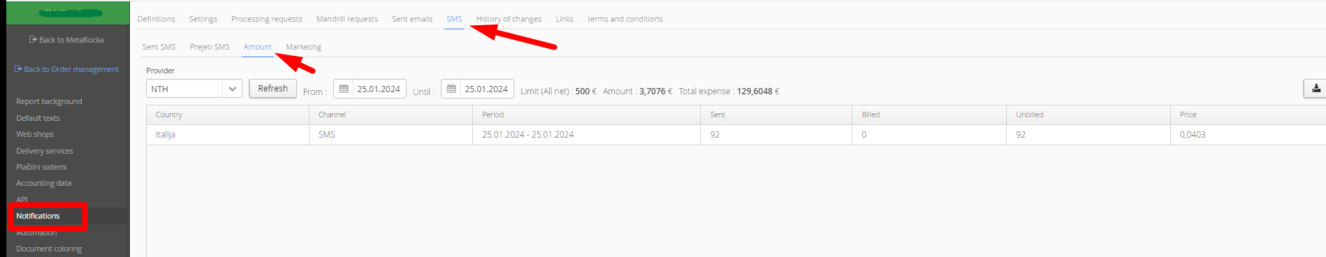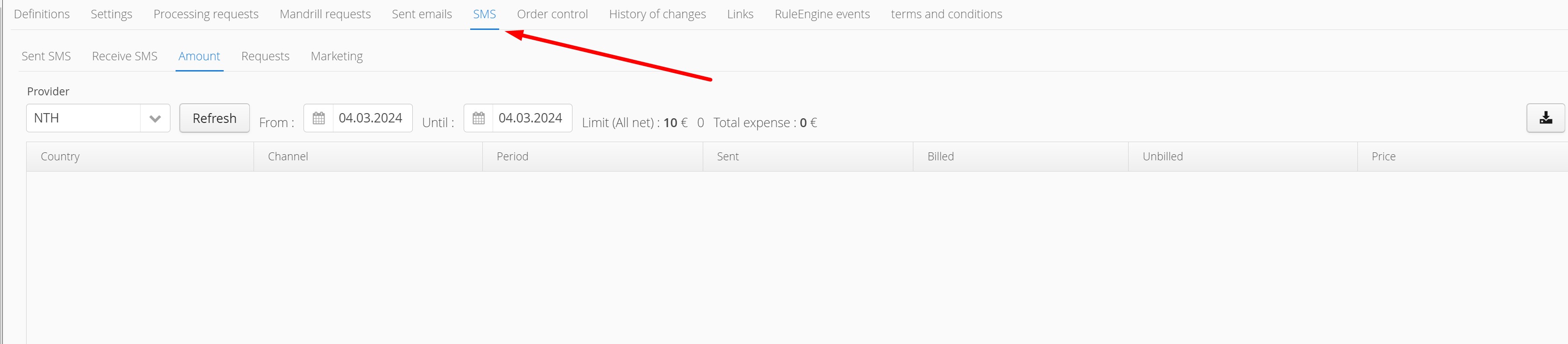 Los SMS enviados pueden visualizarse en las pestañas “SMS enviados” y “Importe”, donde también se muestran los costos de envío. En la parte inferior puede consultarse la tarifa actual de SMS.
