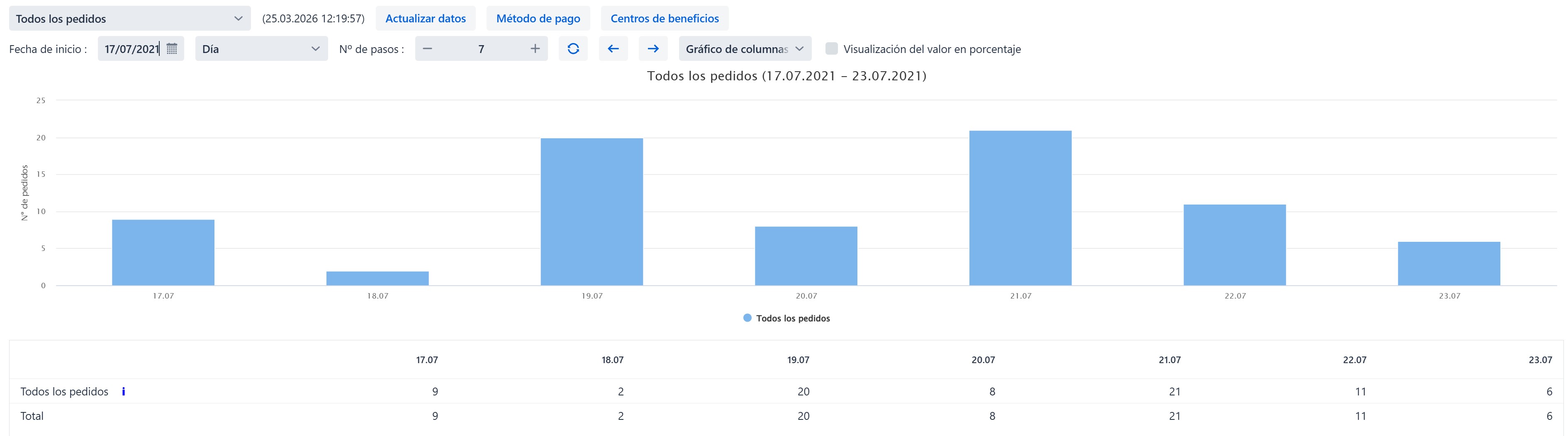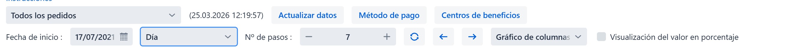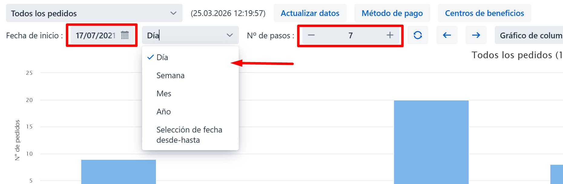 En el momento de seleccionar un periodo, establezca la fecha inicial para luego seleccionar si quiere que la visualización sea por día, semana, mes o año, o elija la visualización por intervalo de fecha (desde, hasta). Al seleccionar el número de pasos, elija para cuántos días, semanas, meses,... se debe representar el gráfico a partir de la fecha de inicio seleccionada.
