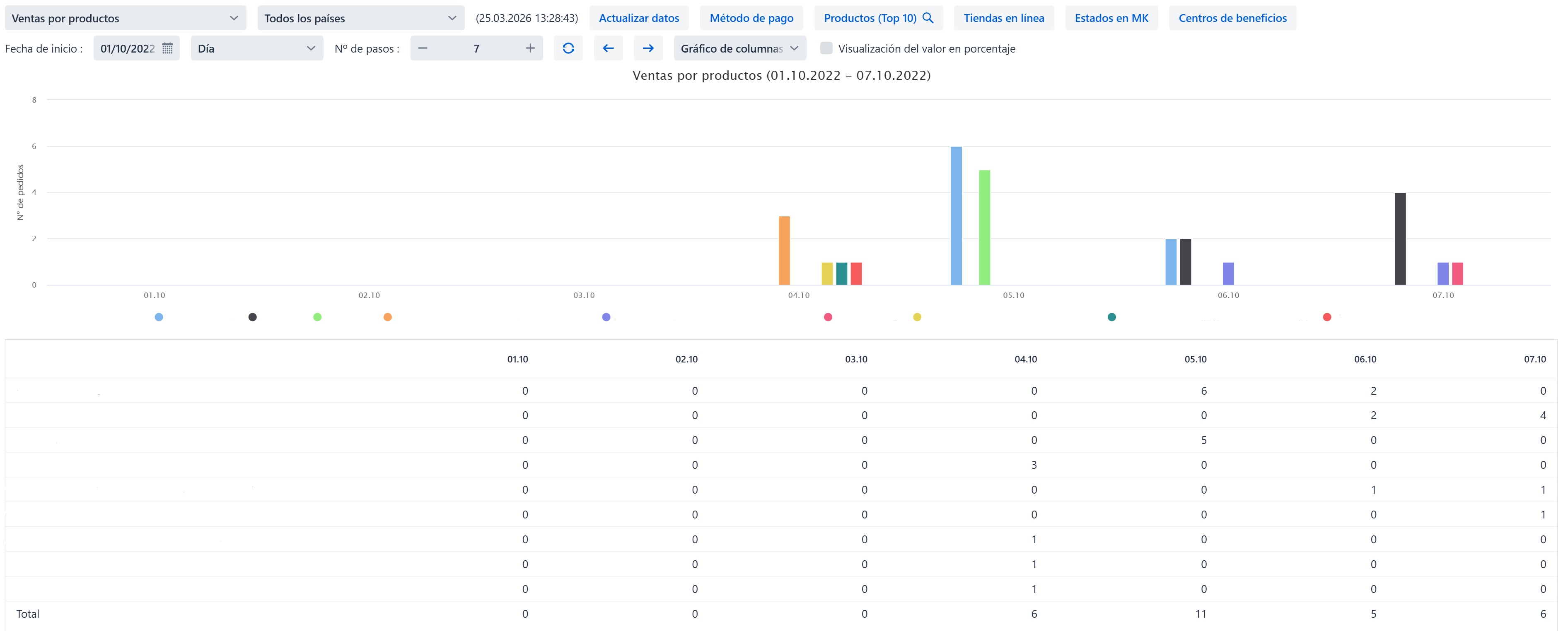 El gráfico muestra las ventas de cada producto para un periodo seleccionado. También es posible filtrar por diferentes criterios: