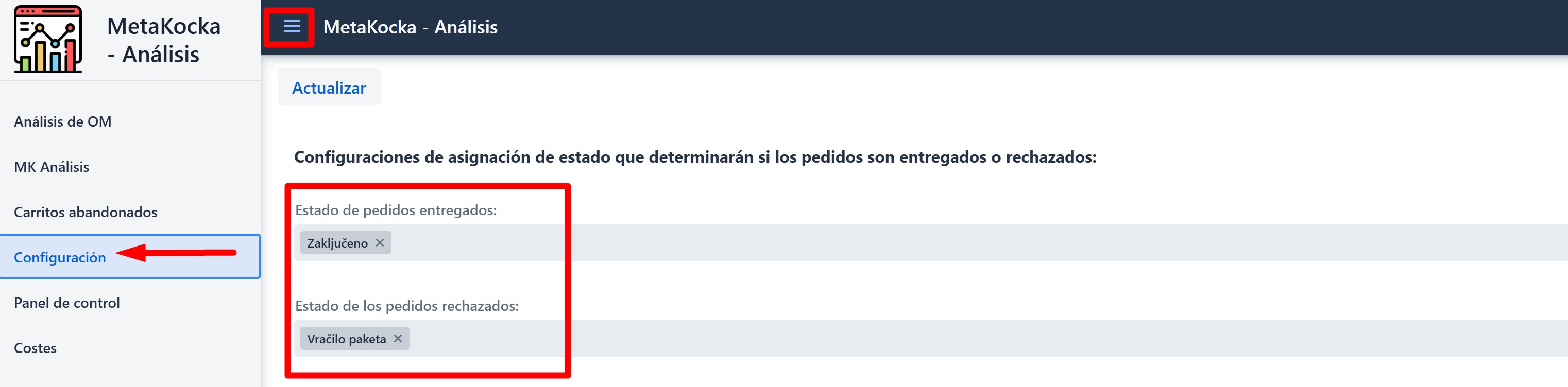 Bajo "Estado de los pedidos rechazados", inserte los estados correspondientes a pedidos rechazados. Por lo general, suele ser el estado "Devolución de paquete".