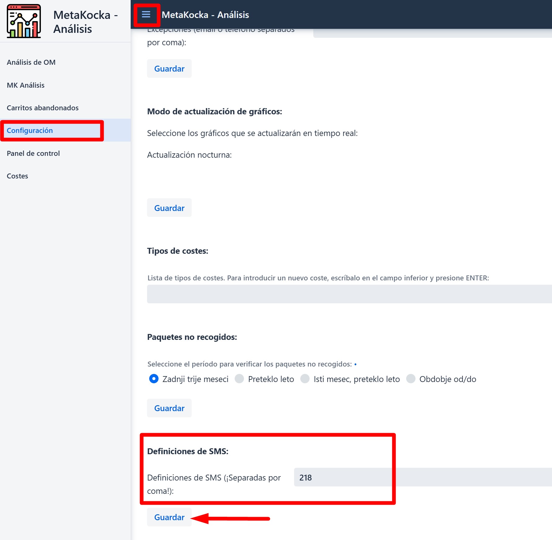 En configuración, introduzca el ID de definición de los SMS que deban incluirse en el análisis: