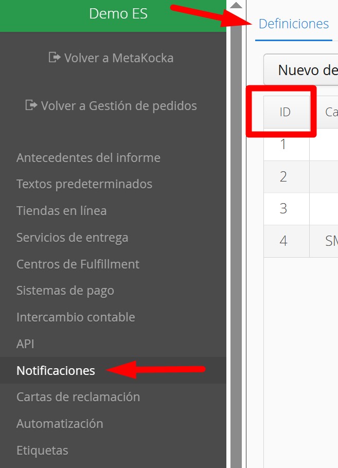 Encontrará el ID de definición en "Ajustes adicionales-> Notificaciones -> Definiciones":