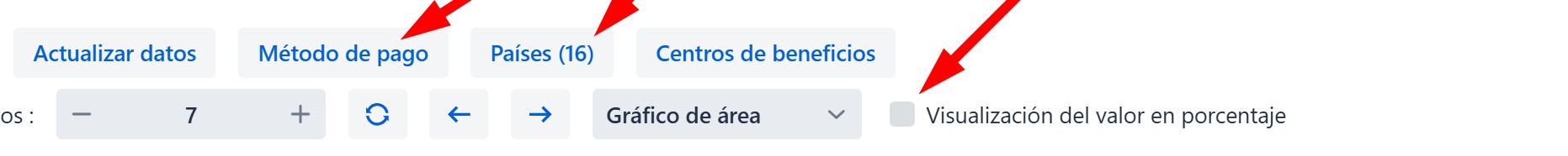 Los datos se pueden filtrar por métodos de pago individual o por país; asimismo es posible la visualización en porcentajes.