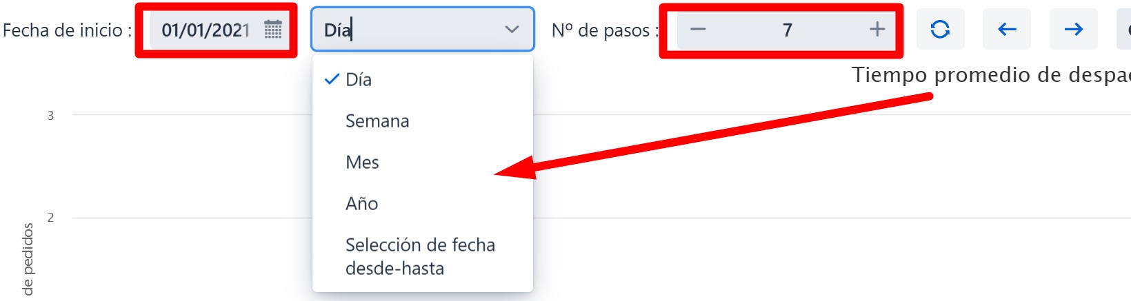 En el momento de seleccionar un periodo, establezca la fecha inicial para luego seleccionar si quiere que la visualización sea por día, semana, mes o año, o elija la visualización por intervalo de fecha (desde, hasta). Al seleccionar el número de pasos, elija para cuántos días, semanas, meses,... se debe representar el gráfico a partir de la fecha de inicio seleccionada.