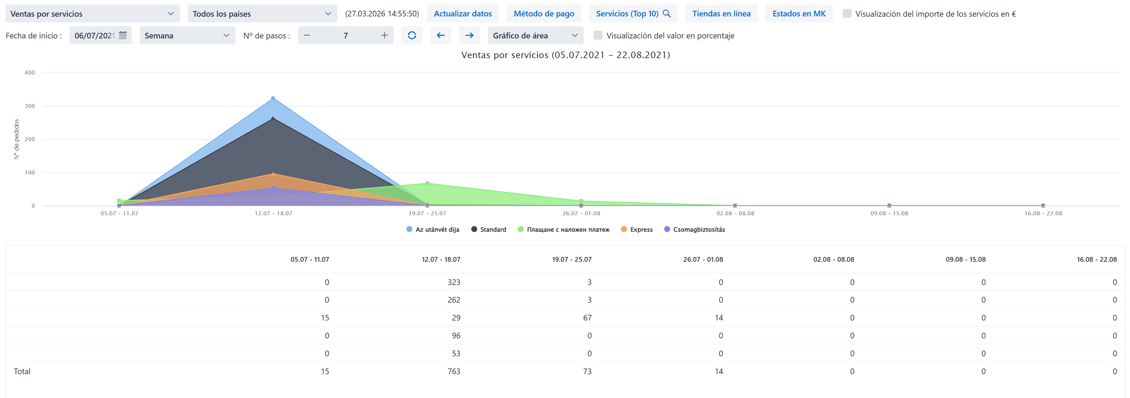 El gráfico muestra las ventas por servicios: Envío exprés, Garantía...