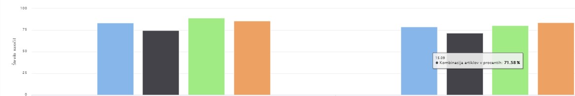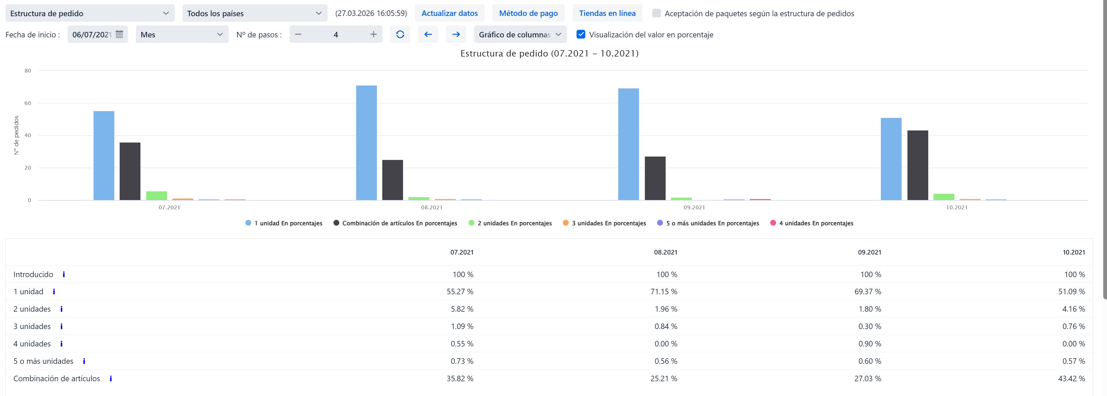 Así pues, el gráfico muestra la estructura de los pedidos y, al seleccionar la visualización de los valores en porcentajes, también presenta la distribución porcentual de dicha estructura: