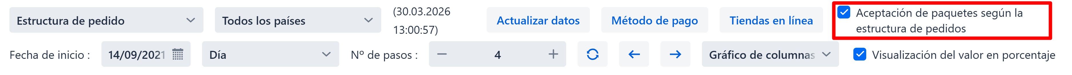 Al hacer clic en 'Aceptación de paquetes según la estructura de pedidos', se mostrarán los datos sobre el estado de entrega de los paquetes, donde la fecha seleccionada representa la fecha de despacho del pedido.