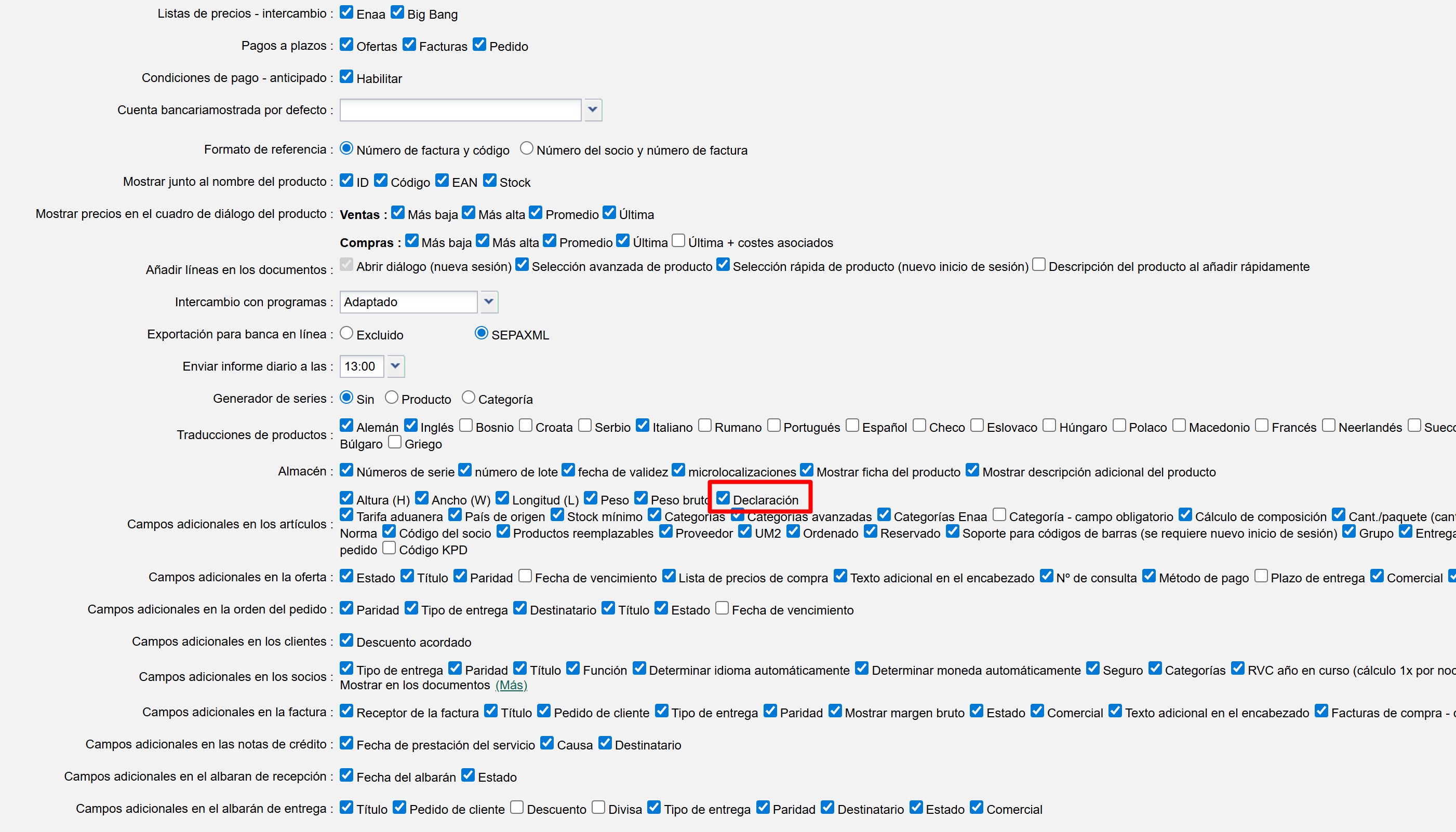 En Configuración -> Su empresa -> Campos adicionales en los artículos, marque la casilla Declaración. Guarde los cambios