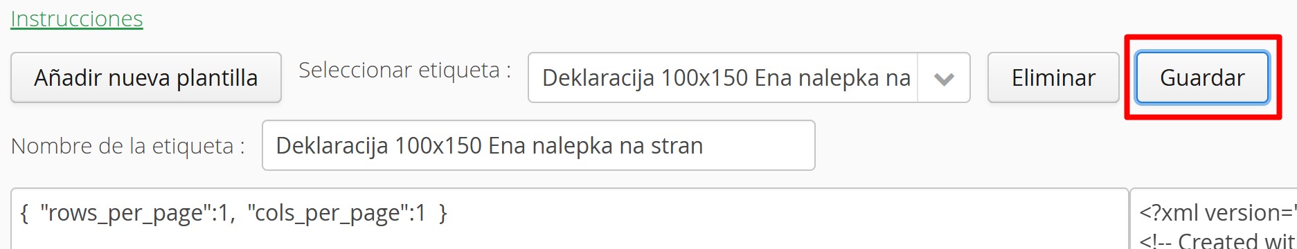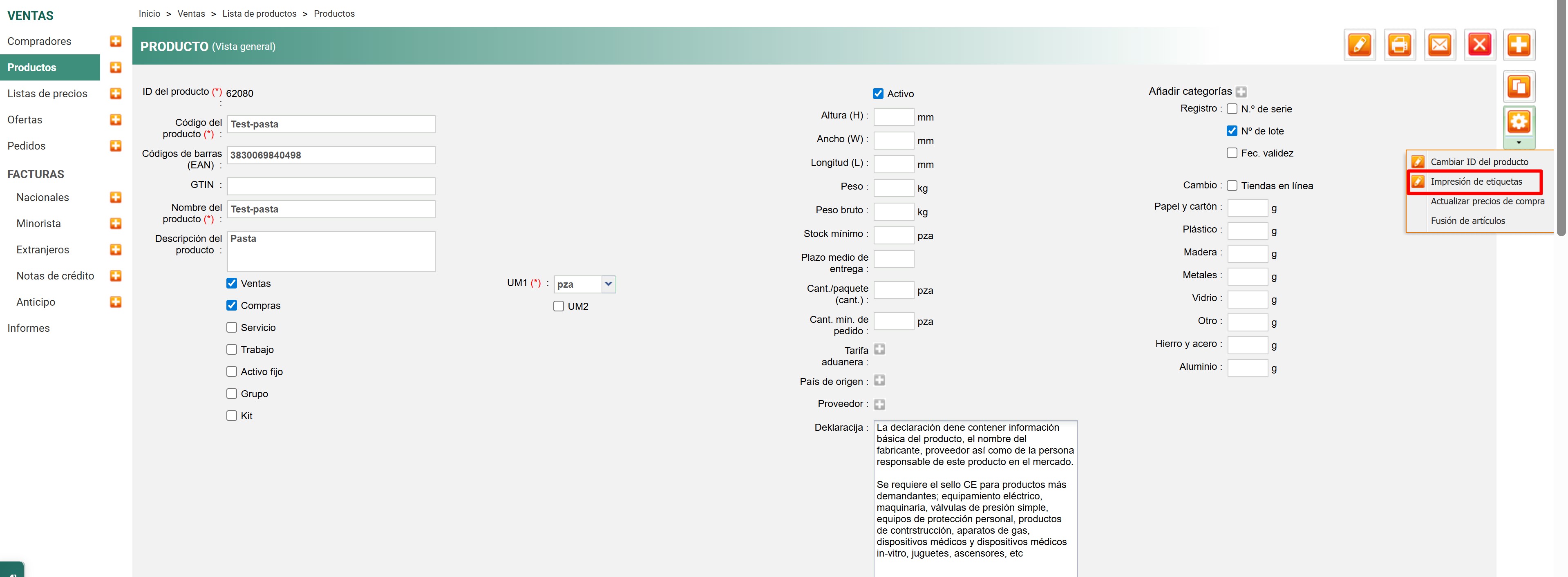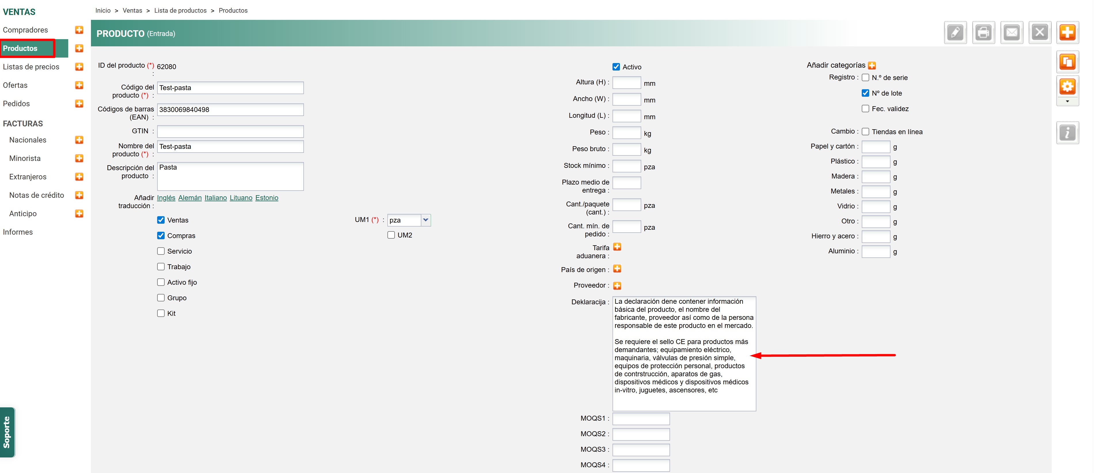 En la página del producto, aparecerá un campo donde puede rellenar los datos de la declaración. Una vez completado, guarde los cambios.
