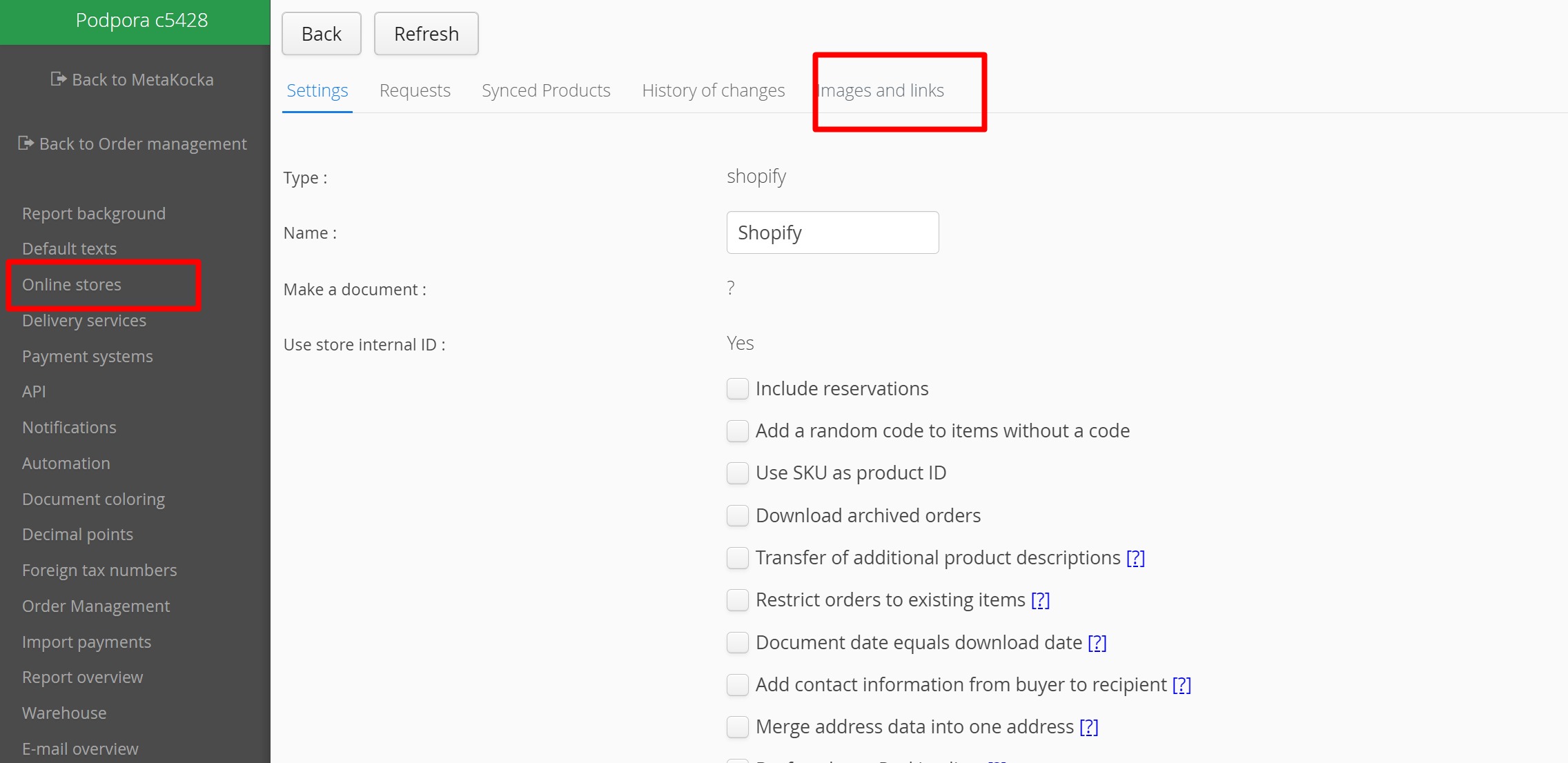 Las imágenes y enlaces descargados, así como los datos de sincronización, se encuentran en la sección de tiendas online, donde también puede realizar una captura manual haciendo clic en el botón "Actualizar".