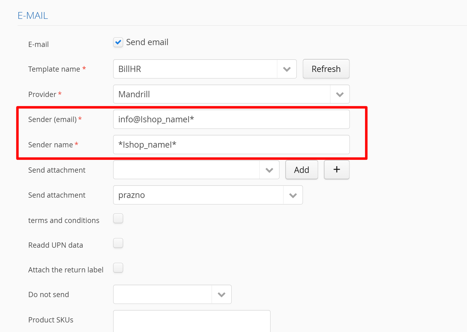 En la definición del correo electrónico, lo especificamos como se muestra en la siguiente imagen (ejemplo), donde el campo mostrará info@najshop.si para la marca seleccionada.