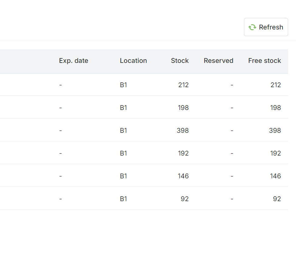Una vez completado, haz clic en Guardar y el stock será visible en la vista general del almacén.