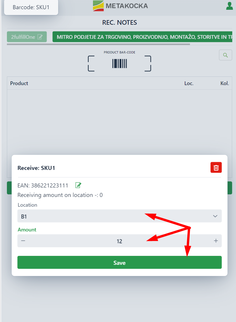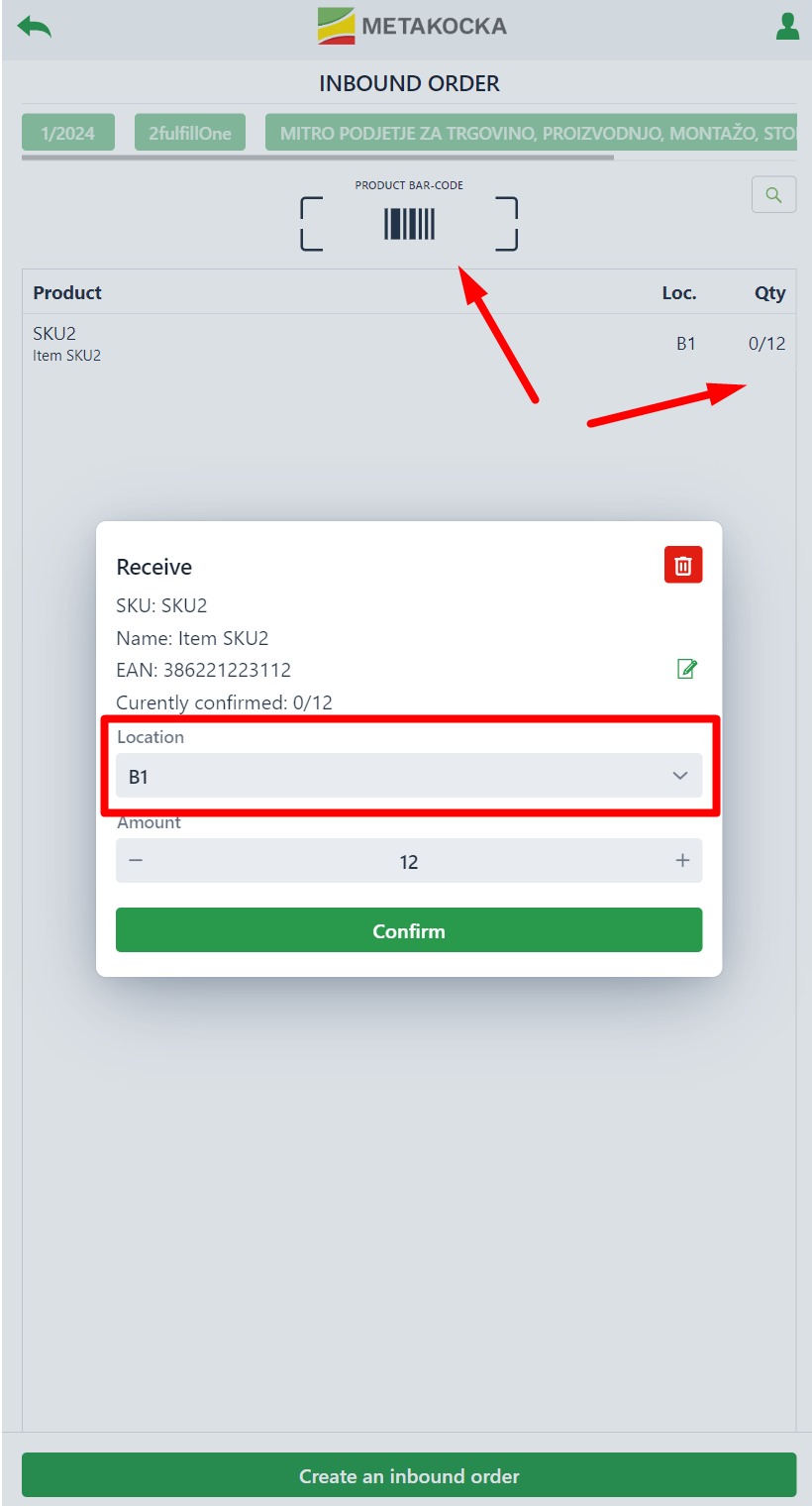 Se abrirá un diálogo con todos los productos que deben ser recibidos. Los productos a recibir pueden escanearse o la cantidad recibida puede confirmarse manualmente. Introduce la ubicación donde estarán los productos y presiona Confirmar.