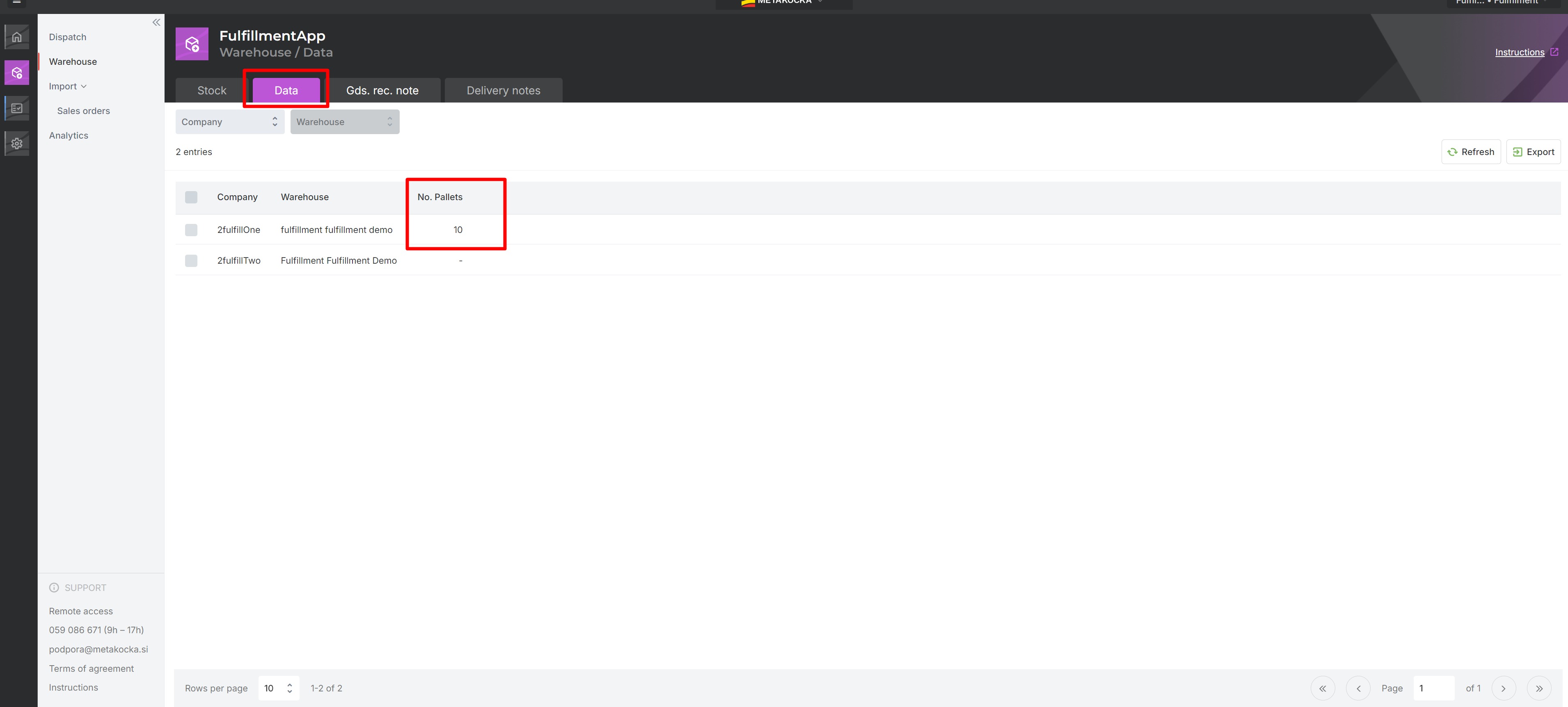 En la sección de Datos, puedes ingresar el número de pallets pertenecientes a determinada empresa que ocupan espacio en el almacén.
