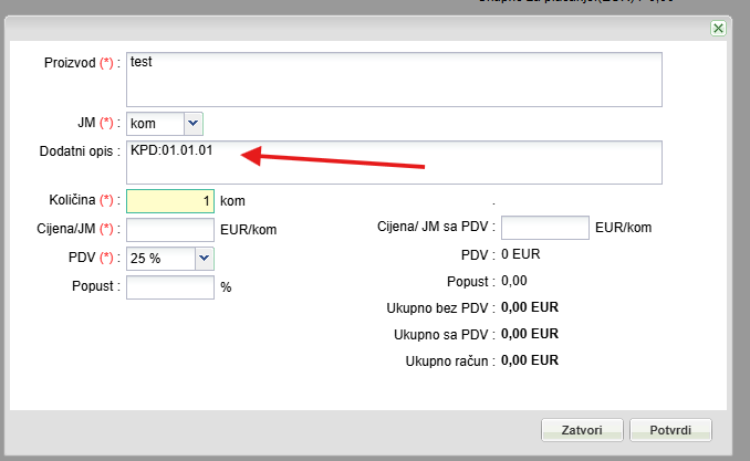 Ako unosite stavku kao slobodan unos, potrebno je unijeti i KPD kod, i to: