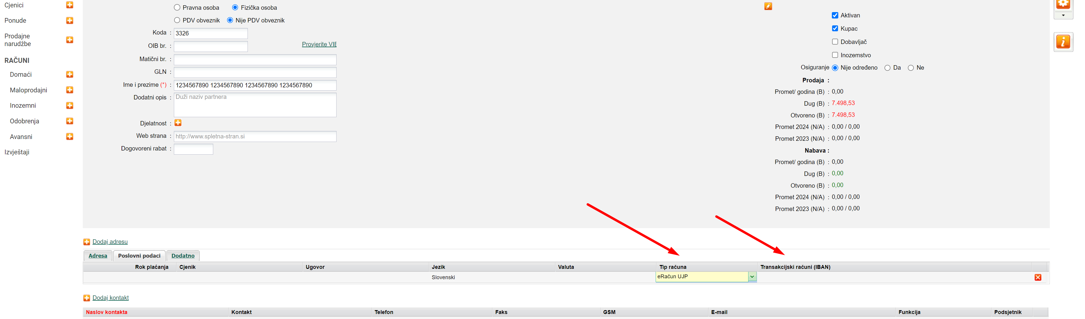 1. Kupci – tab poslovni podaci – odredite tip računa “eRačun” ili "eRačun UJP" i unesite transakcijski račun na koji kupac prima eRačune.