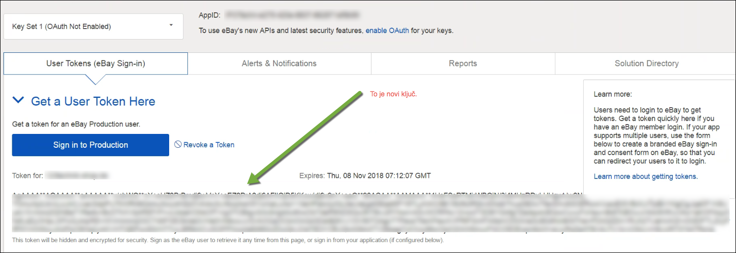 API ključevi obično imaju rok trajanja od 1.5 godine. Kada rok istekne, više nije moguće izvoditi komunikaciju. Ako odaberete ''Test veze'' u slučaju nemačkog eBay-a dobit ćete pogrešku '"Da das Authentifizierungs-Token unwiderruflich abgelaufen ist, muss der Benutzer ein neues Token für diese Anwendung generieren.". Ispod je opisana procedura za produžavanje trajanja ključa