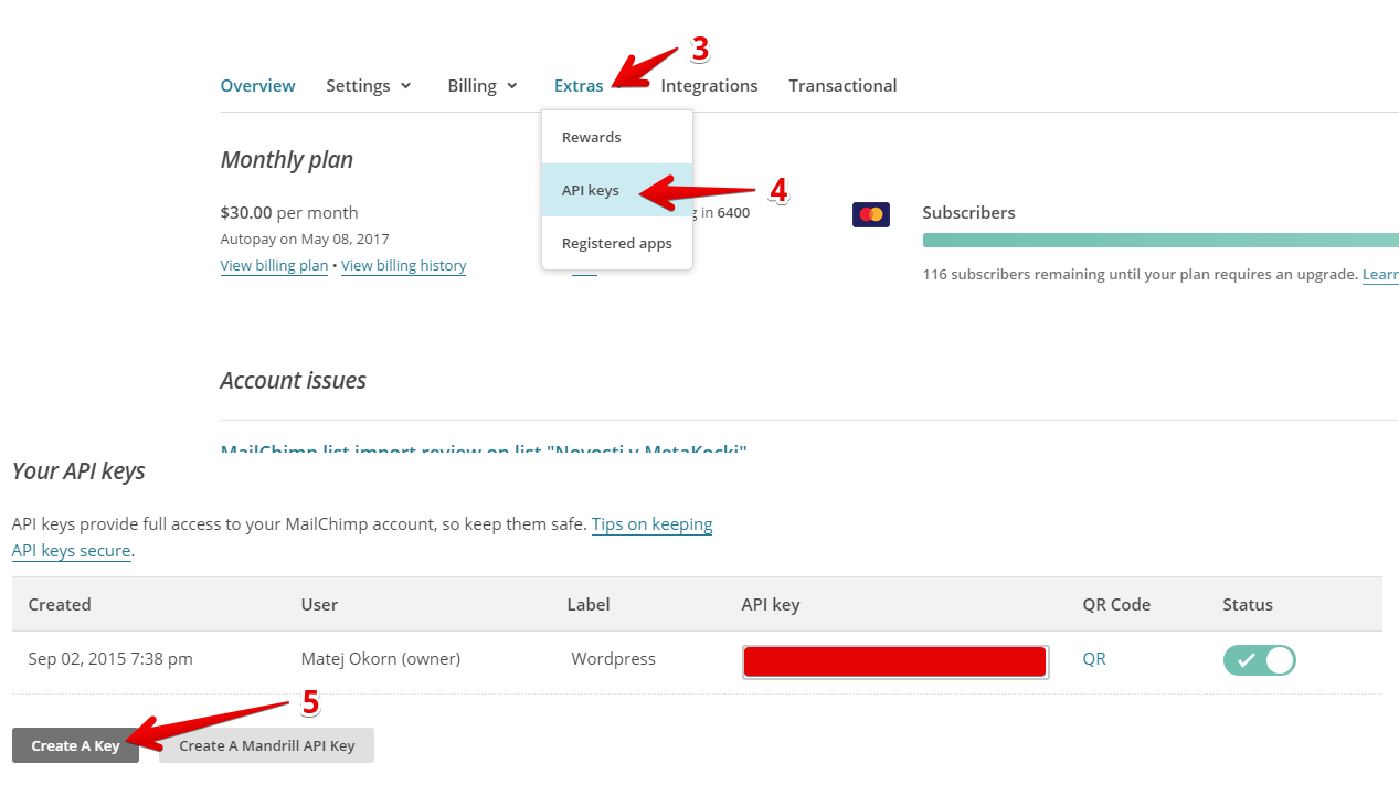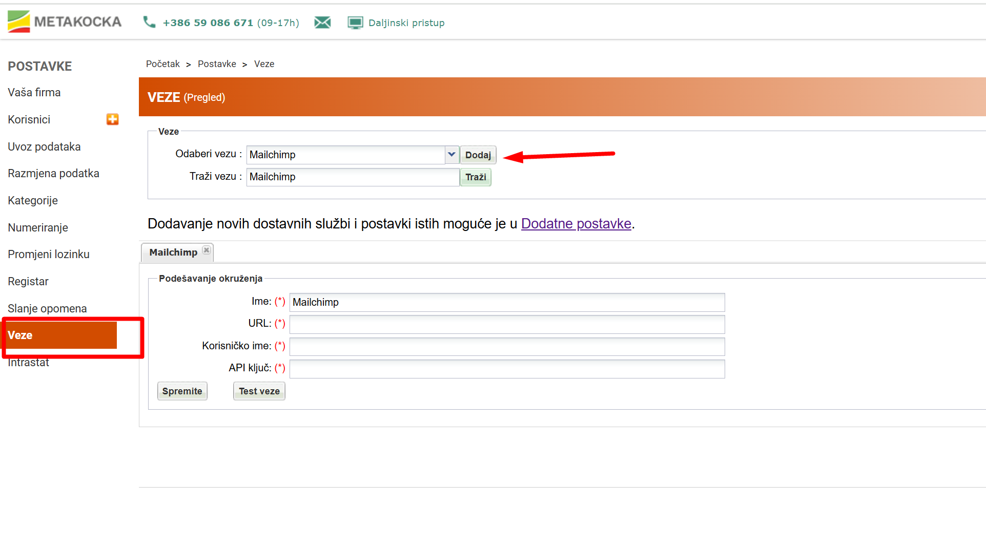 Za uspostavljanje veze s MailChimp sistemom za slanje elektroničkih poruka iz MetaKocke potrebno je pribaviti sljedeće podatke: