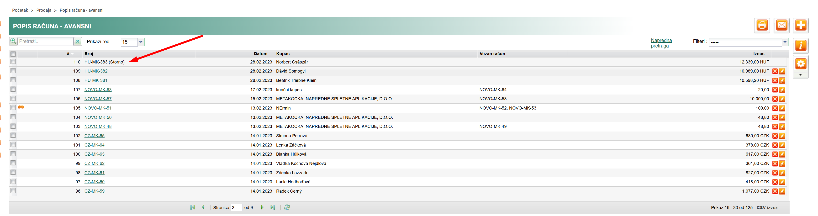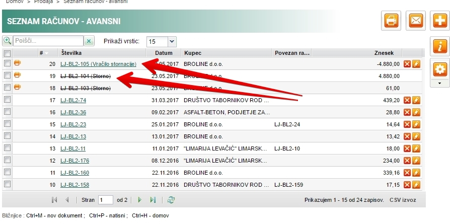Na avansni račun će se dodati tekst (storno) i u popisu avansnih računa bit će precrtan (prikazano dolje).