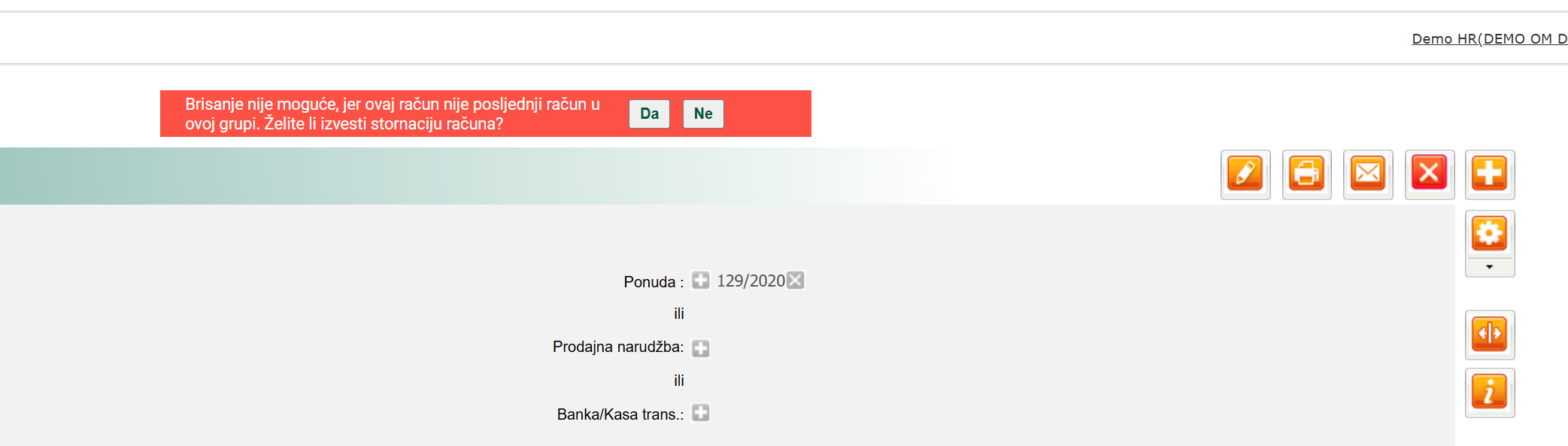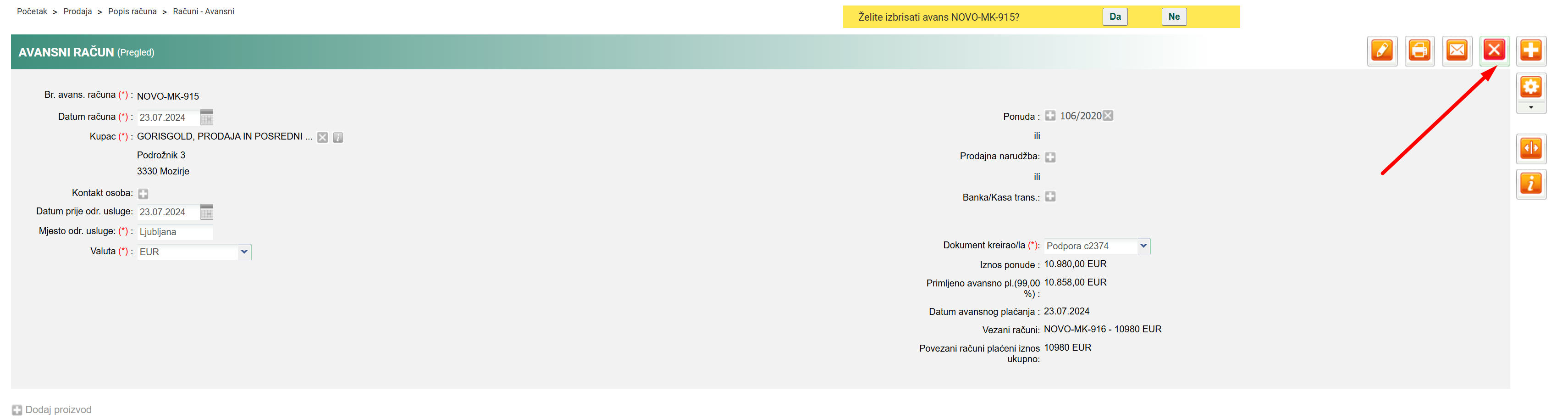 Nakon klika, prikazat će se upozorenje o brisanju – odaberite "Da". Ako avansni račun nije posljednji u nizu, program će vam ponuditi mogućnost za storno.