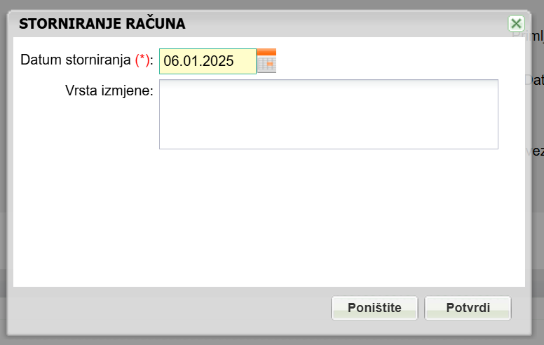 Nakon klika na "Da", otvori se dodatni dijalog za unos razloga storniranja.